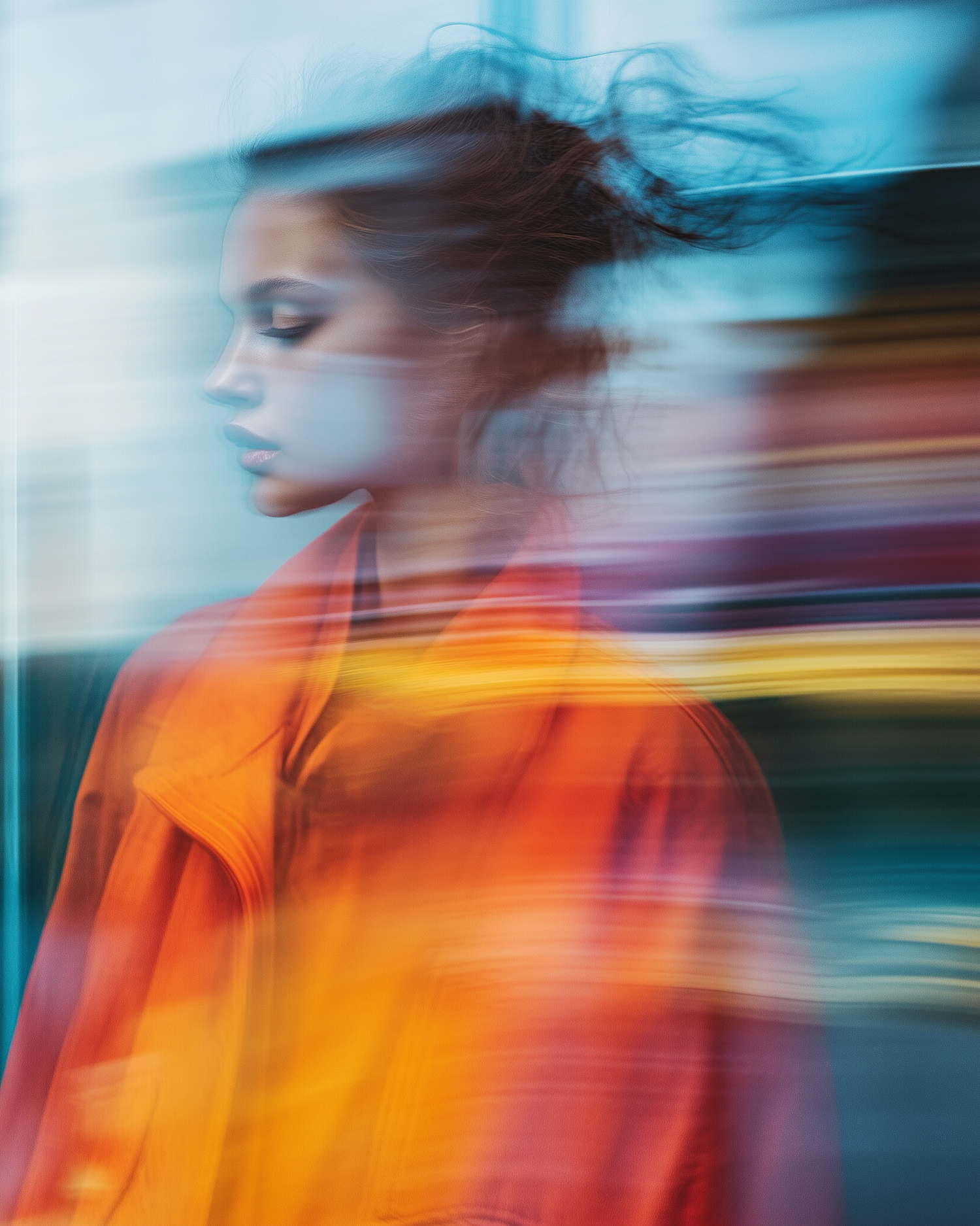 Artistic blurred portrait of a woman in an orange coat, with dynamic blue and yellow streaks creating a sense of motion.