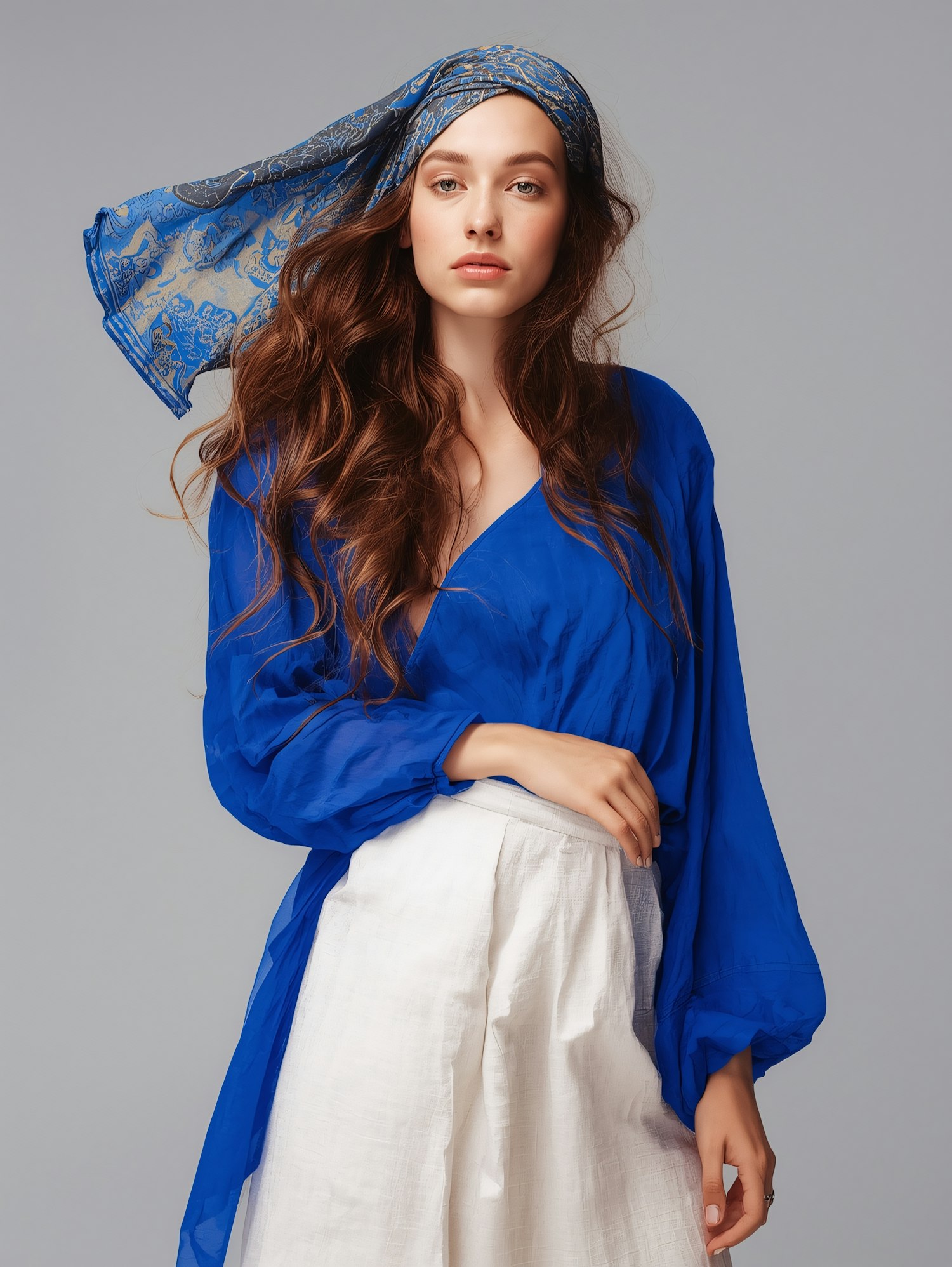 A woman in a flowing blue blouse and white skirt, accessorized with a patterned headscarf, posing against a neutral background.