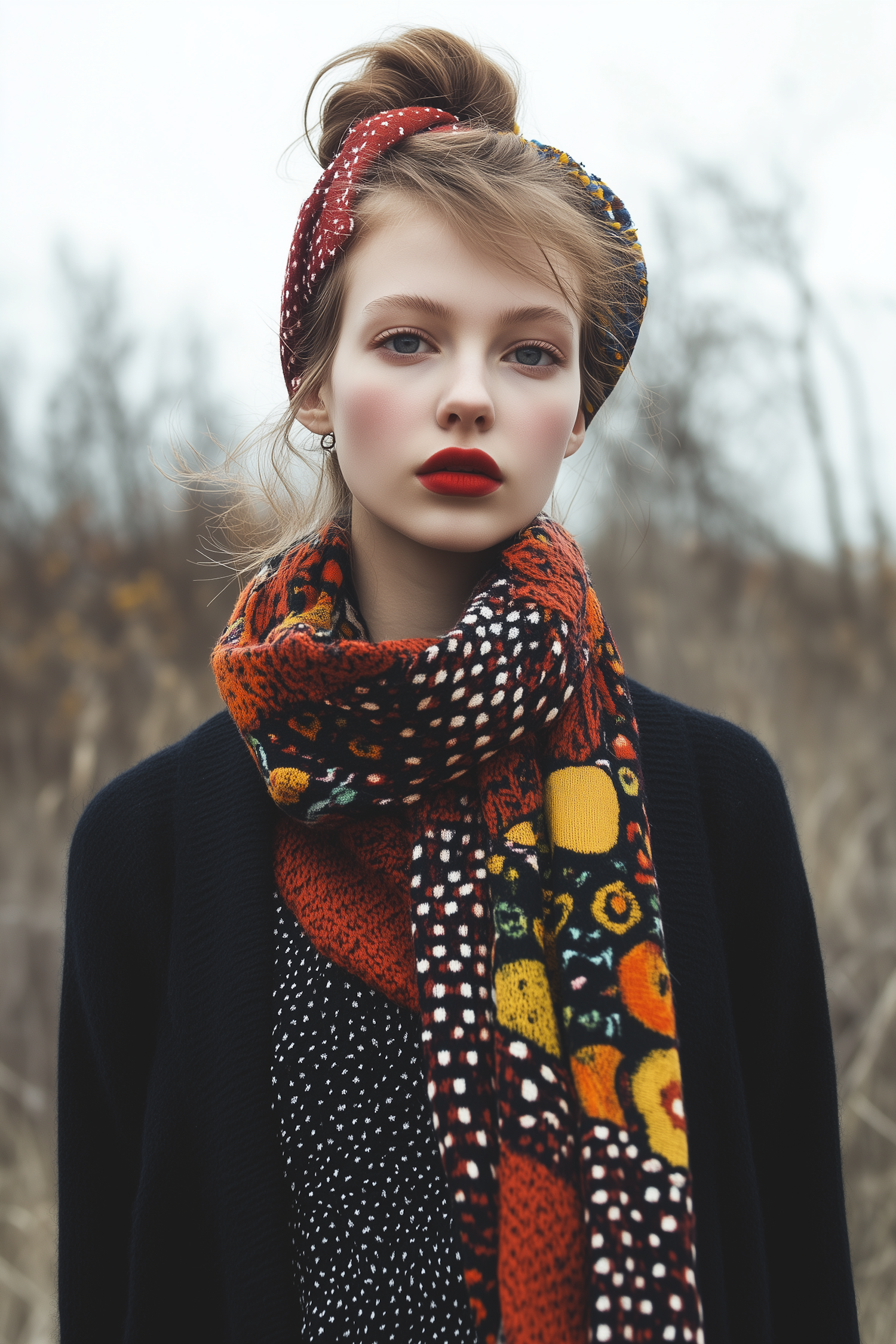 Stylish woman outdoors in a vibrant scarf and headband, with bold red lipstick and a polka-dot dress. Perfect mix of color and texture.