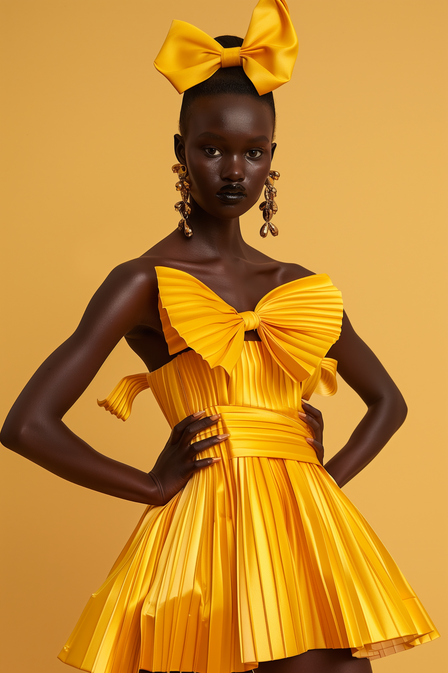 Elegant woman in a vibrant yellow dress with a large bow, matching background, and bold accessories, exuding confidence and style.