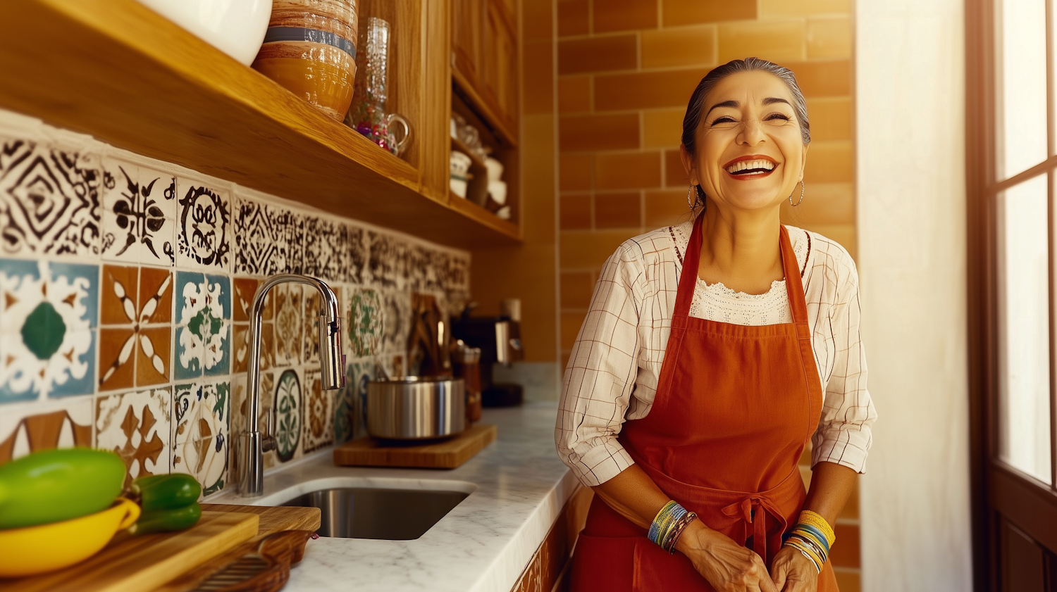 Joyful woman in a cozy kitchen with colorful tiles, wearing a red apron and smiling warmly. Sunlit and inviting atmosphere.