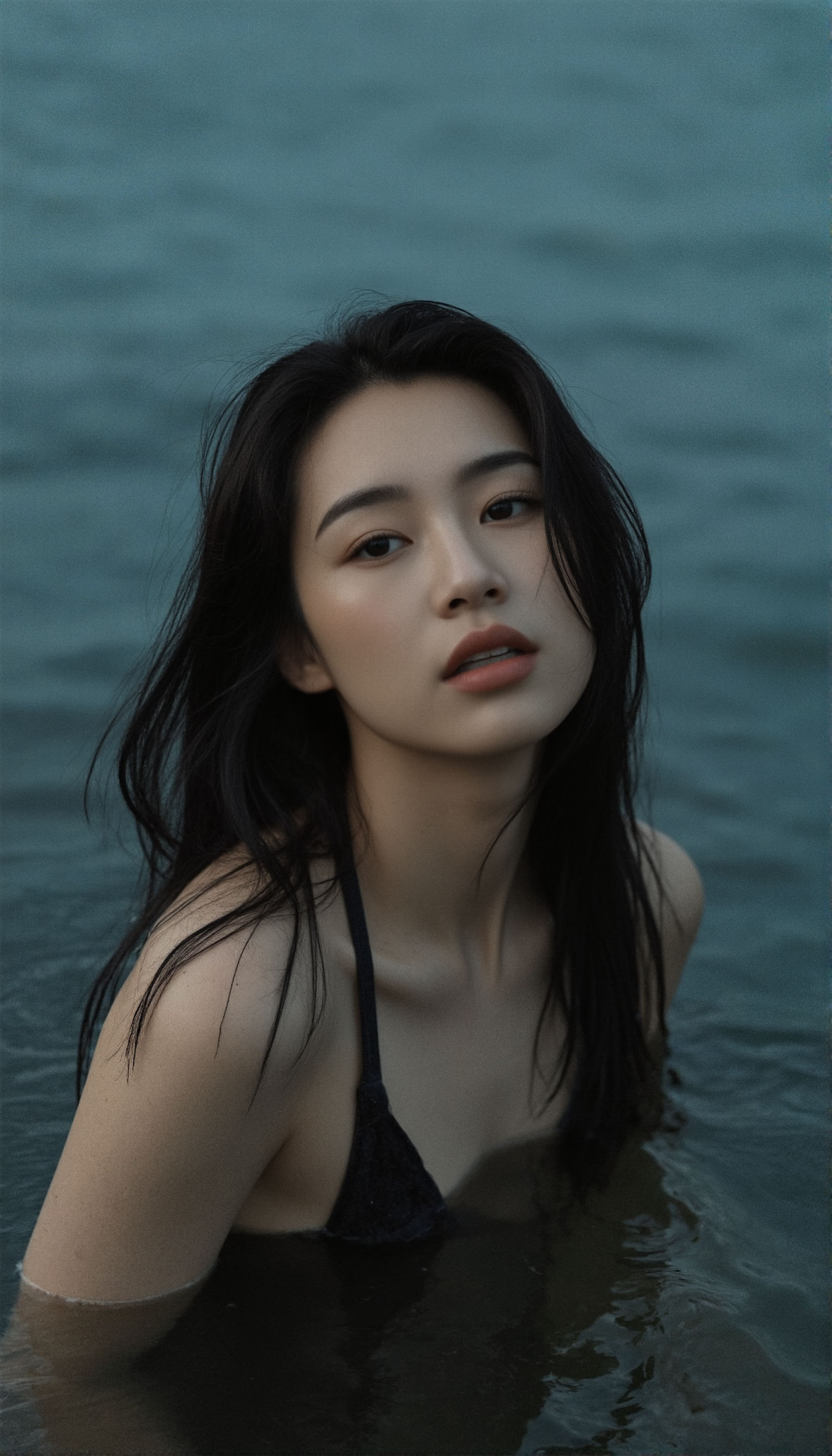 Woman with long dark hair in black bikini top, partially submerged in deep blue water, serene and calm atmosphere.