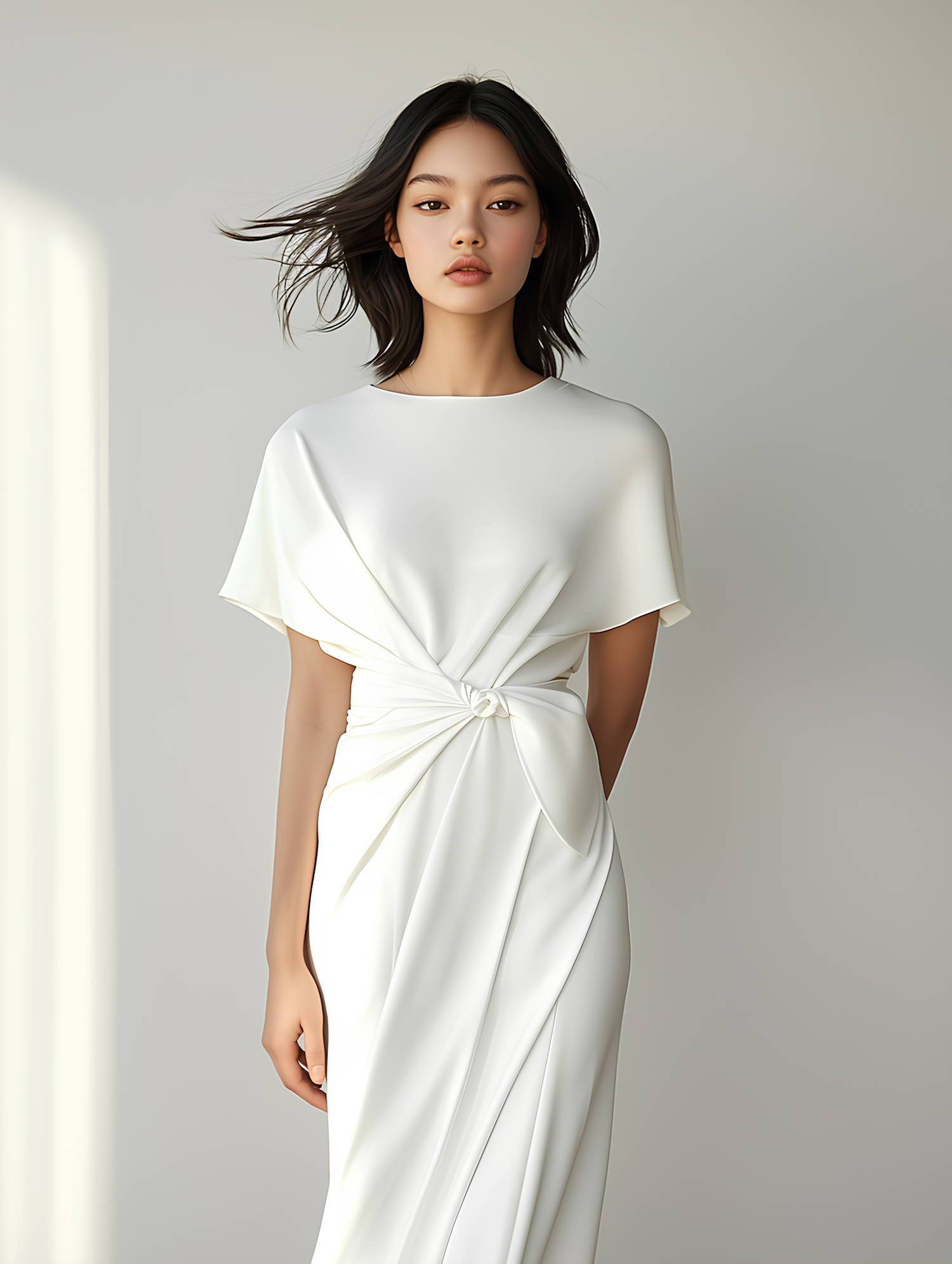 Elegant Asian woman in a flowing white dress with a unique knot design, standing against a soft, neutral background.