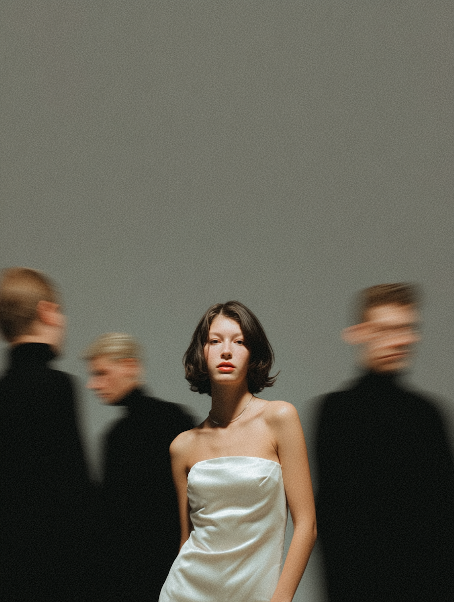 A young woman in a white dress stands still while blurred figures in black move around her, creating a striking contrast.