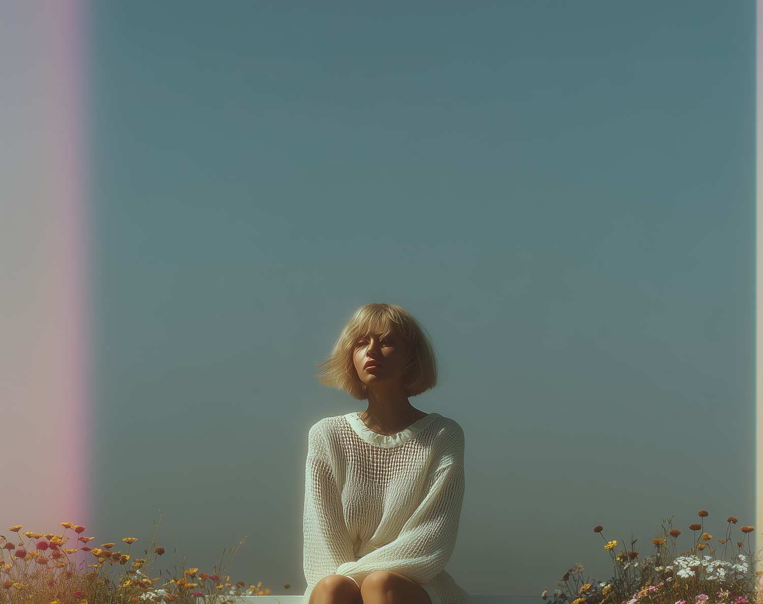 A serene portrait of a woman in a white sweater sitting among wildflowers under a clear blue sky, evoking a peaceful and contemplative mood.
