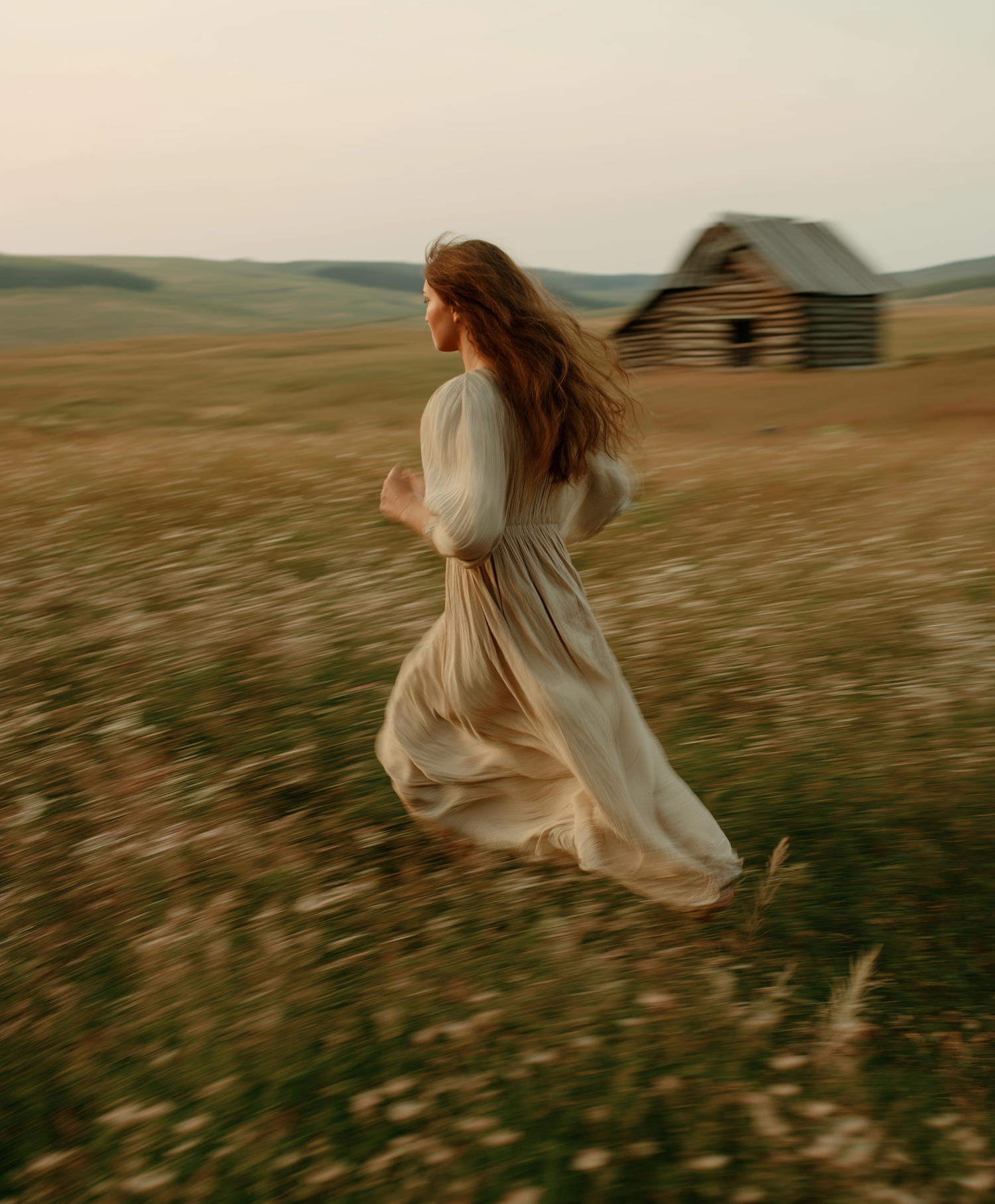 A woman in a flowing beige dress runs through a wildflower field at sunset, with a rustic cabin and rolling hills in the background.
