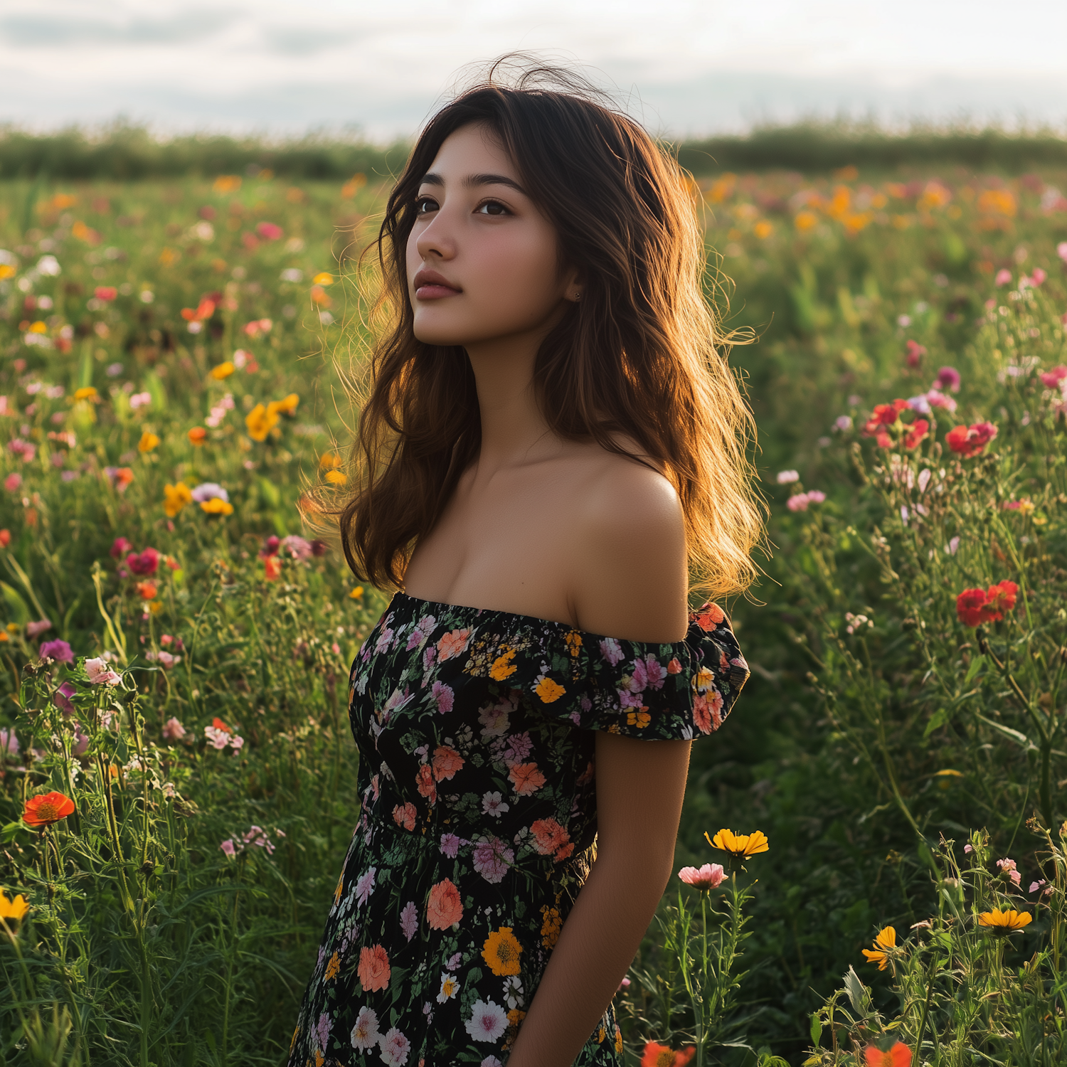 A serene woman in a floral off-shoulder dress stands in a vibrant wildflower field under warm sunlight and a partly cloudy sky.