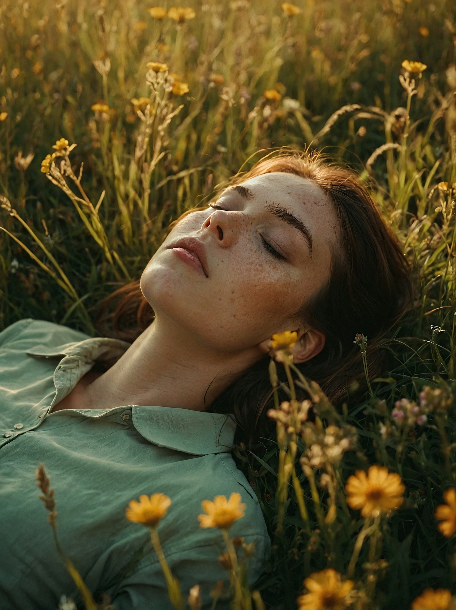 A serene scene of a woman with freckles lying in a field of wildflowers, eyes closed, bathed in warm sunlight.