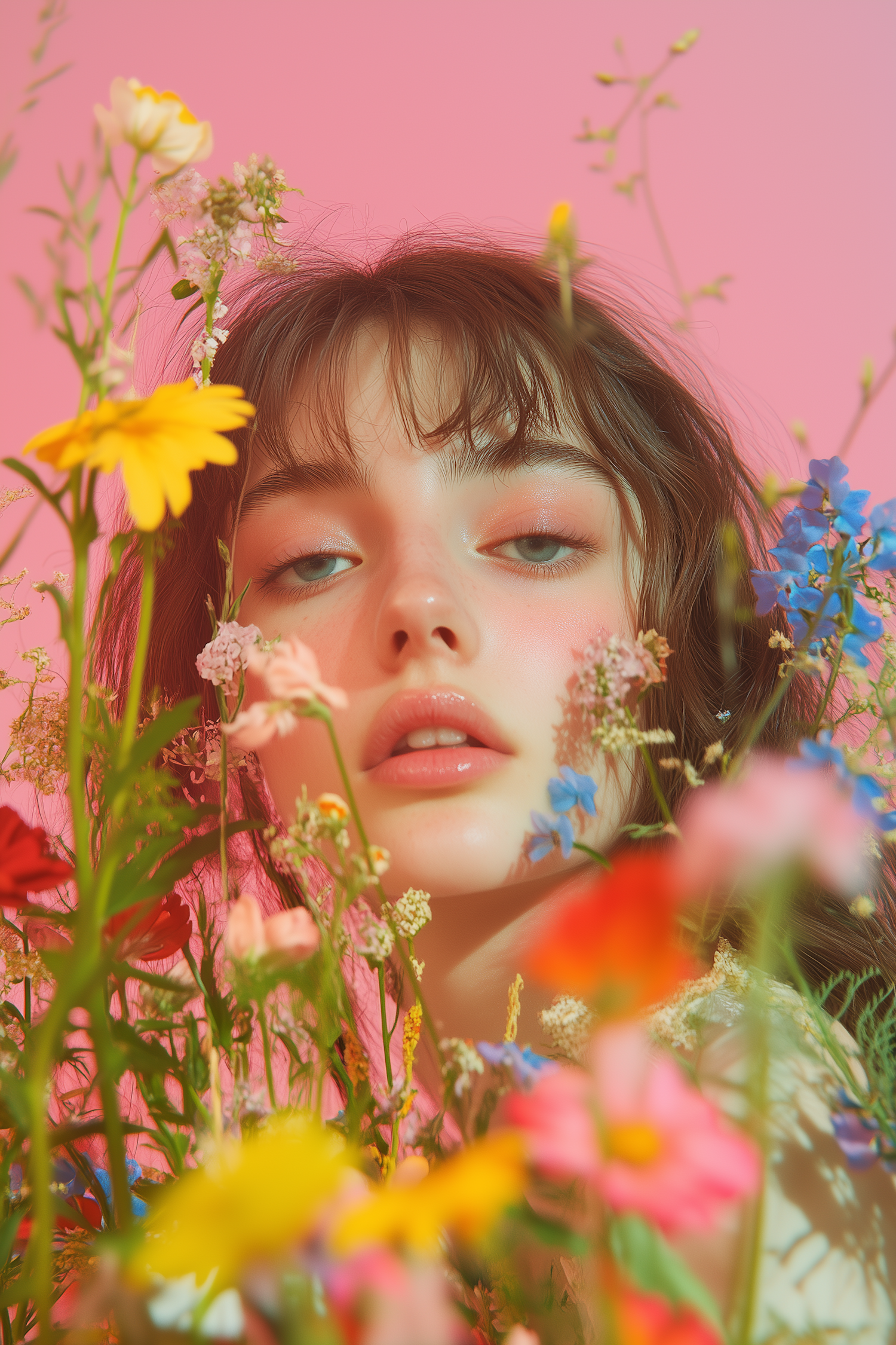 A dreamy portrait of a young woman surrounded by vibrant wildflowers against a soft pink background, creating a serene and ethereal vibe.