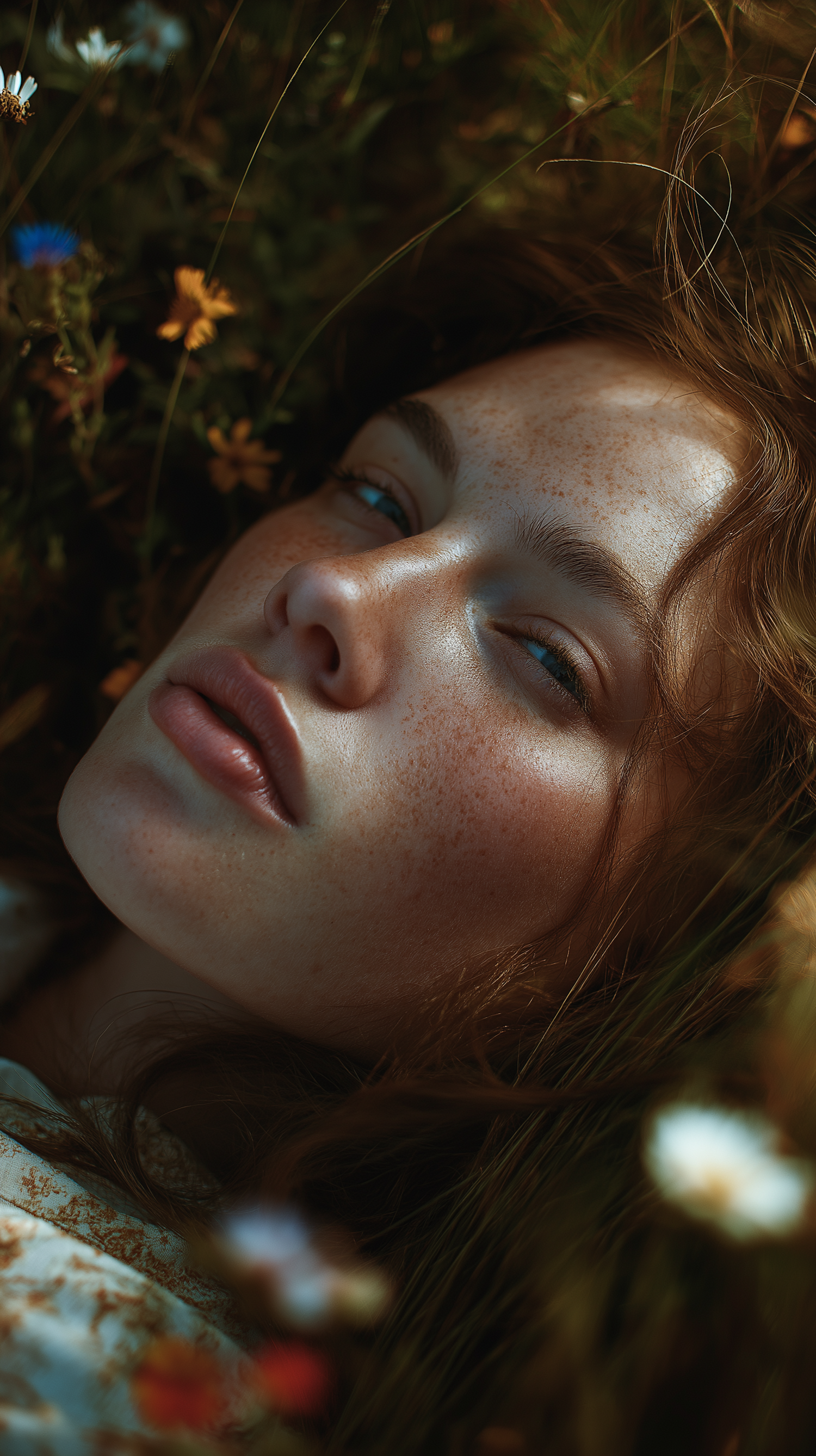 Close-up of a freckled woman with auburn hair lying in a field of wildflowers, bathed in soft natural light.