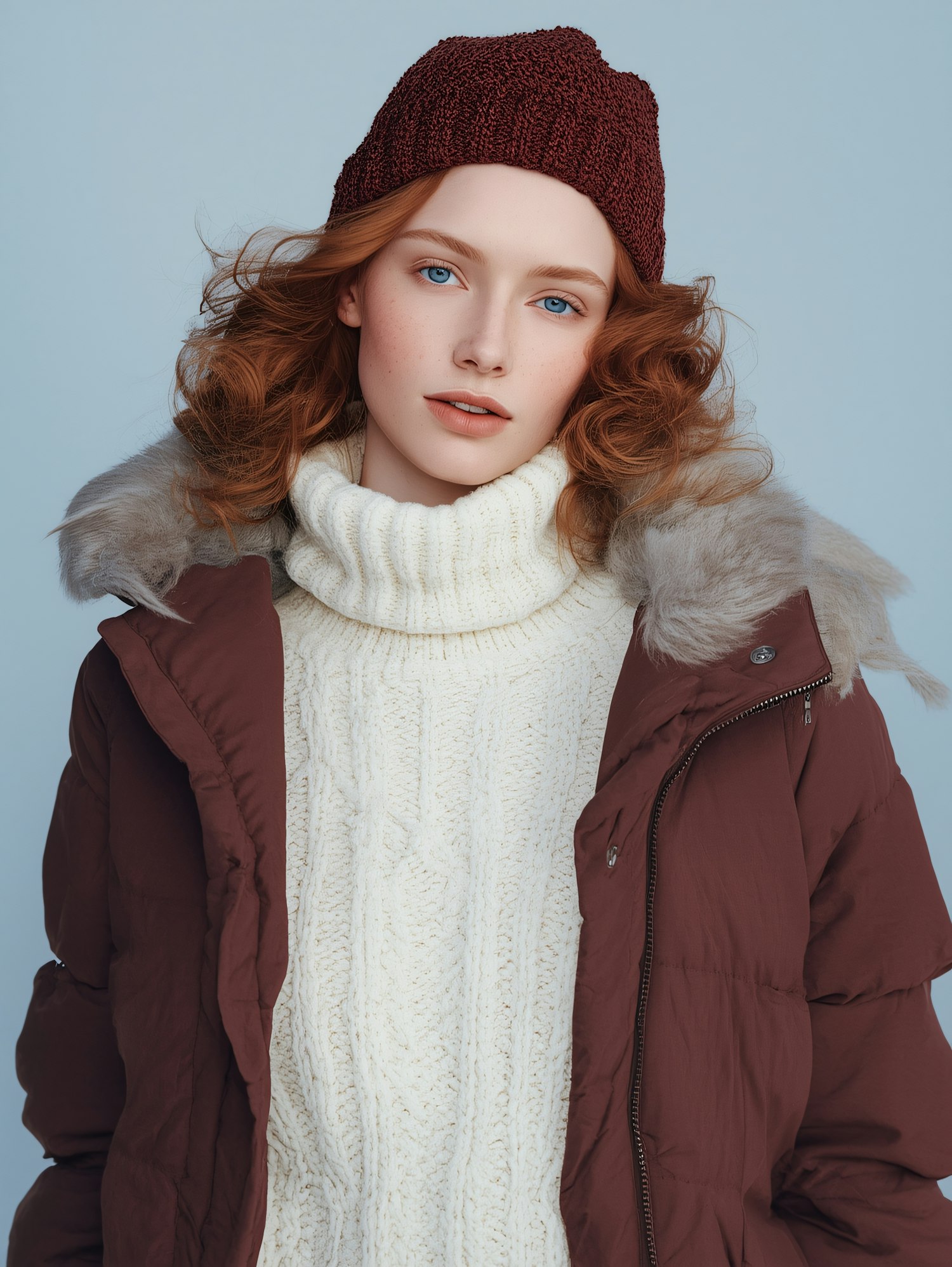 Stylish woman in a maroon beanie and puffer jacket with a white turtleneck sweater, set against a light blue background.