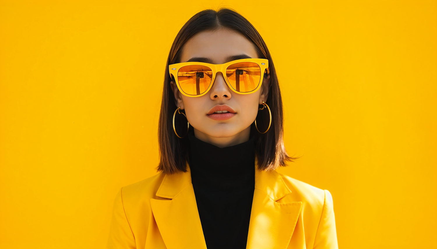 Stylish woman in yellow sunglasses and blazer against a vibrant yellow background, exuding confidence and modern fashion.