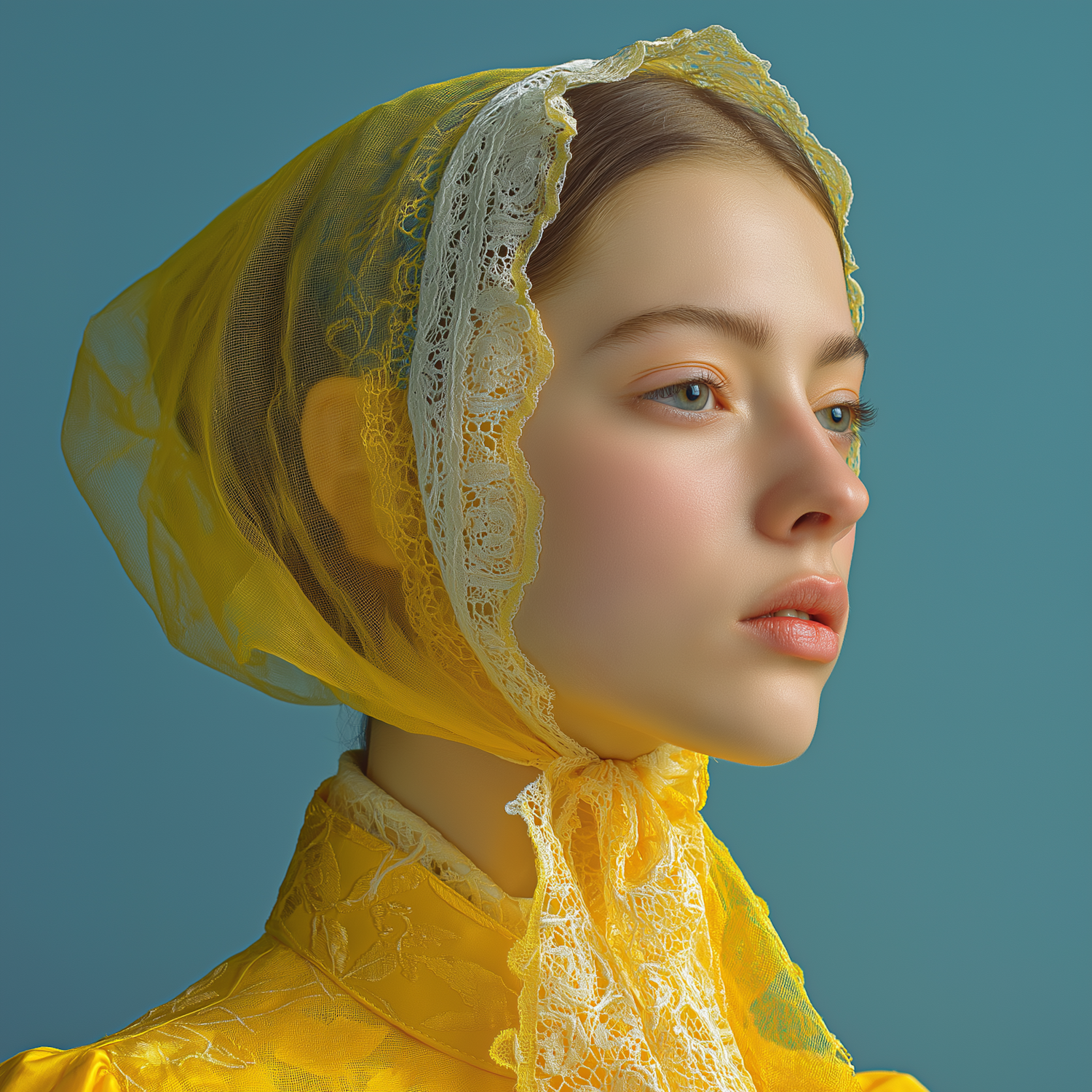 Portrait of a young woman in a yellow lace headscarf and embroidered dress, set against a muted teal background.