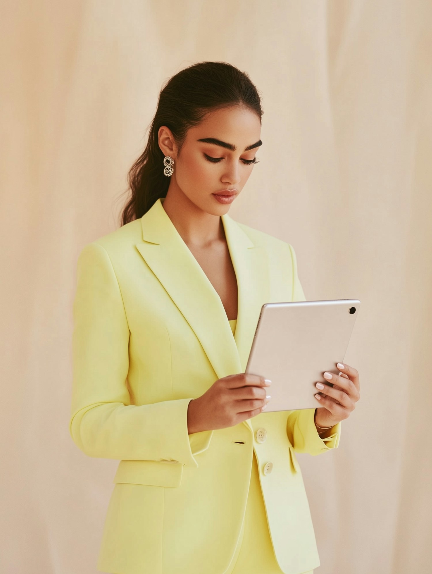 Woman in a bright yellow suit holding a tablet, with elegant earrings and a focused expression against a neutral background.