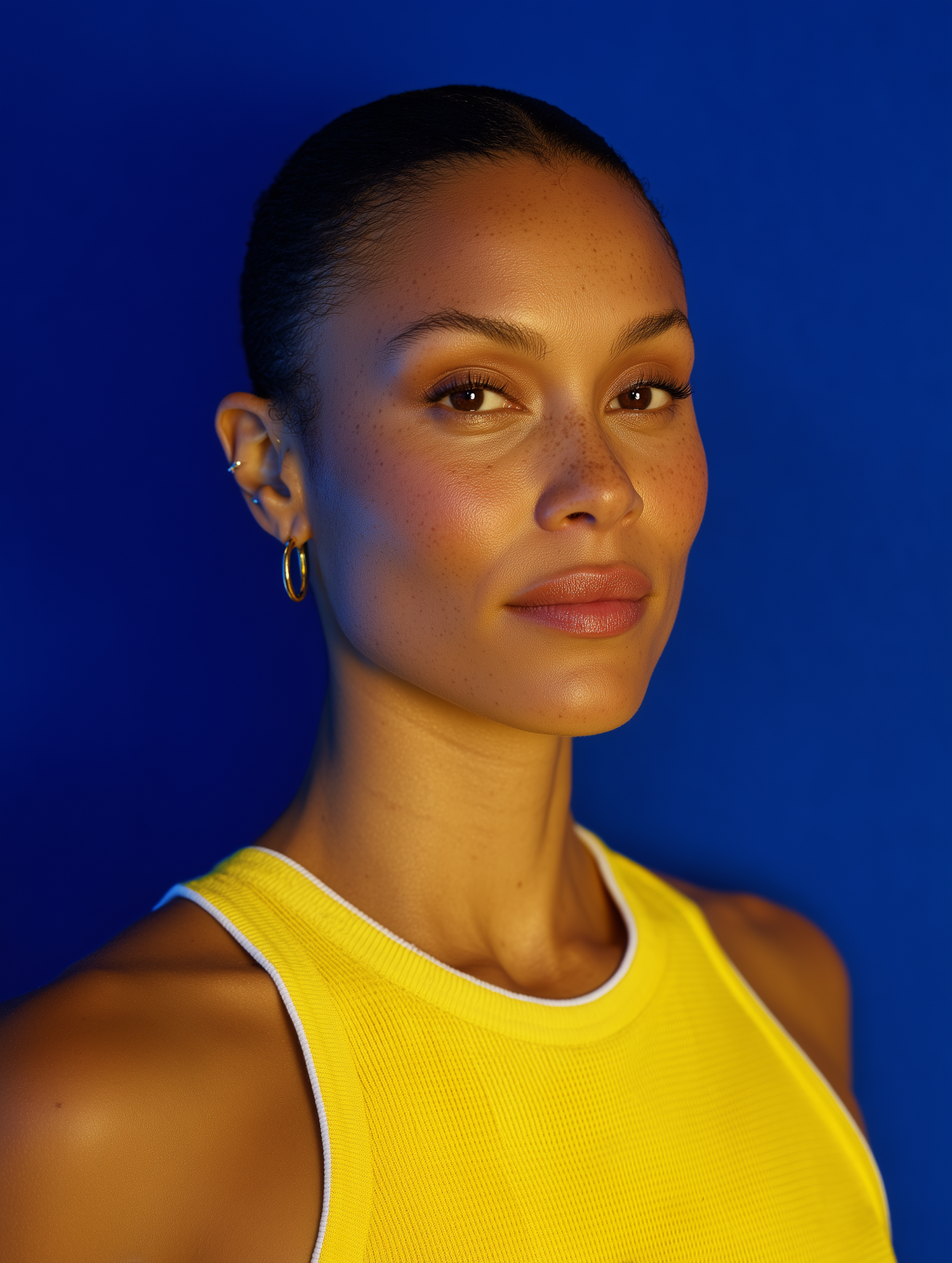 Portrait of a freckled woman in a yellow top against a blue background, showcasing natural beauty and vibrant colors.
