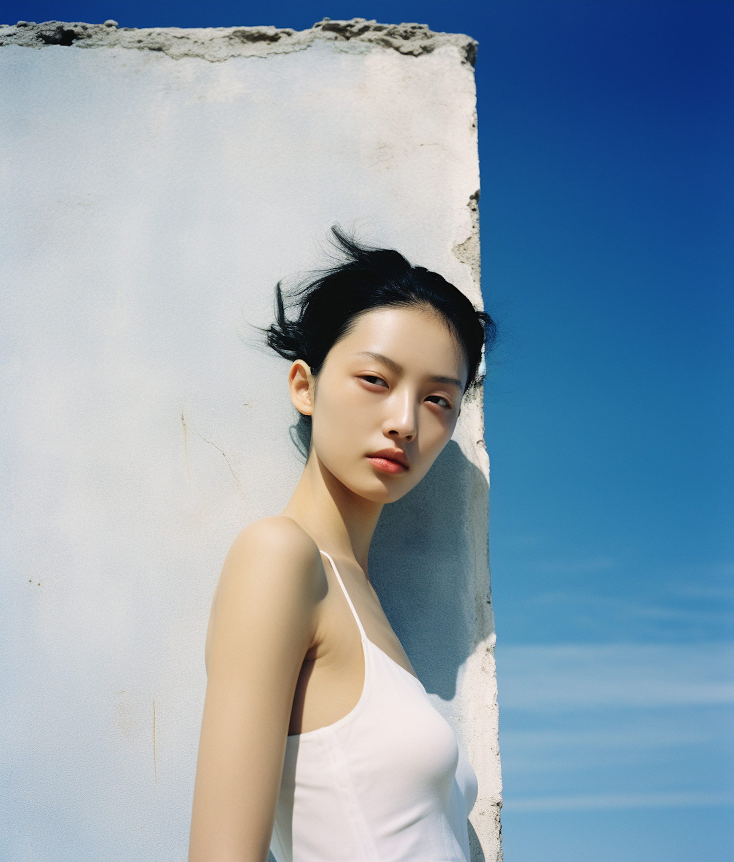 Asian woman in white top against a textured wall with a clear blue sky, exuding calm and elegance.