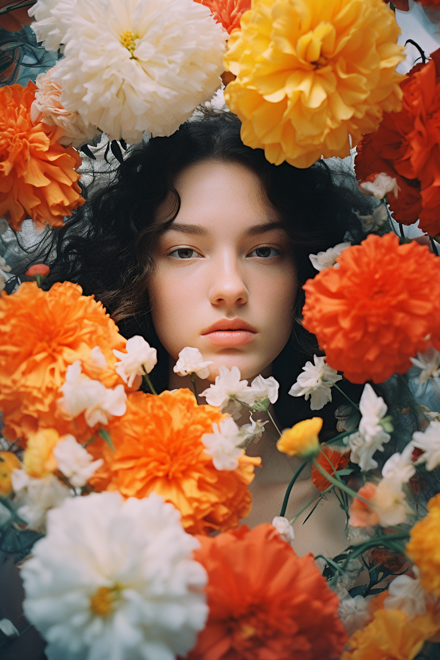 A serene portrait of a woman surrounded by vibrant orange, yellow, and white flowers, creating a harmonious and tranquil scene.