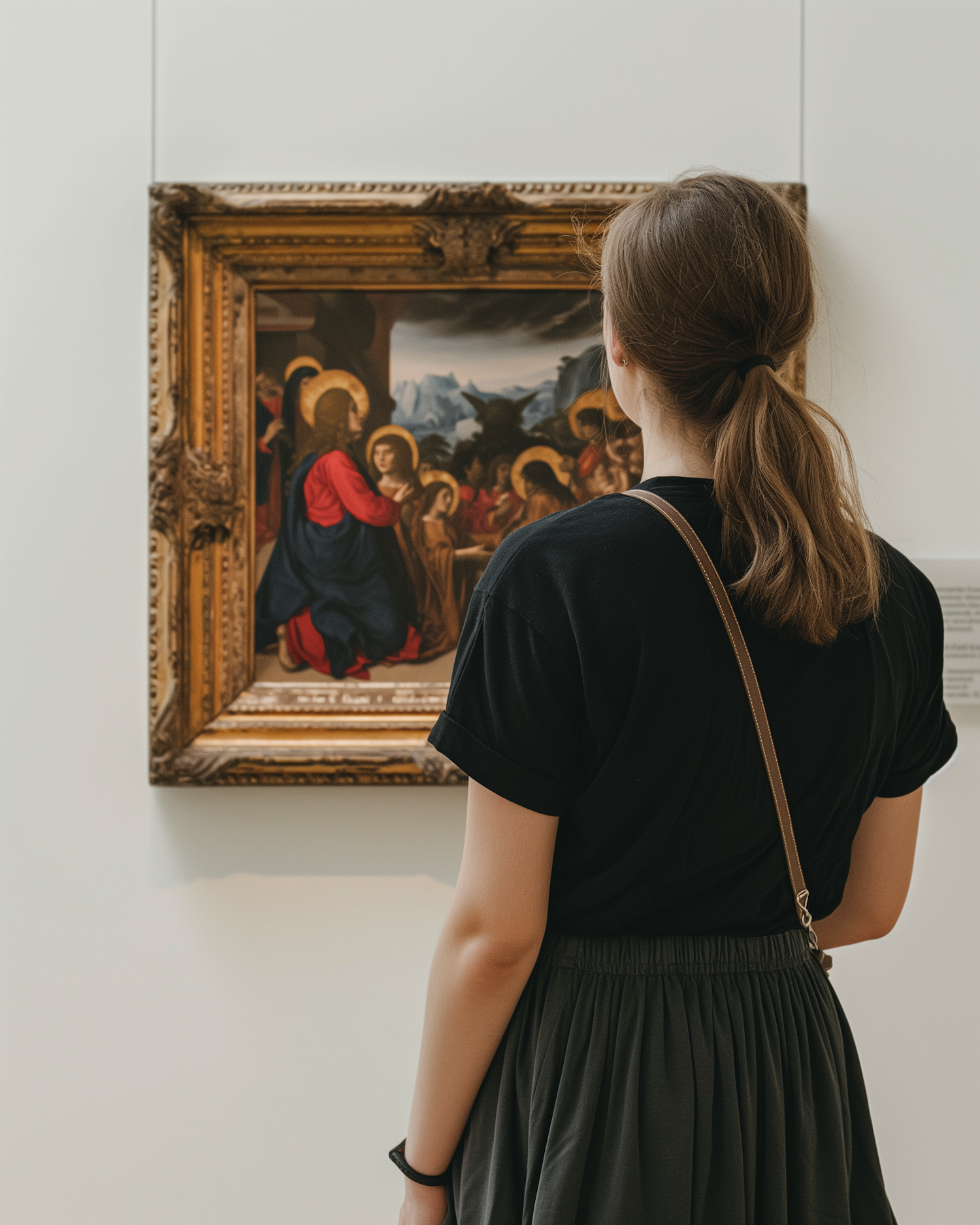 A woman observes a religious painting in a gallery, showcasing an ornate frame and a serene, contemplative atmosphere.