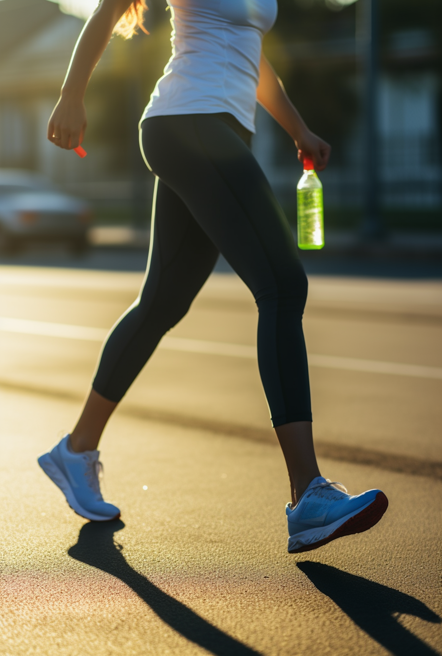 Person walking on a sunlit street holding a green sports drink, wearing athletic gear, casting a long shadow.