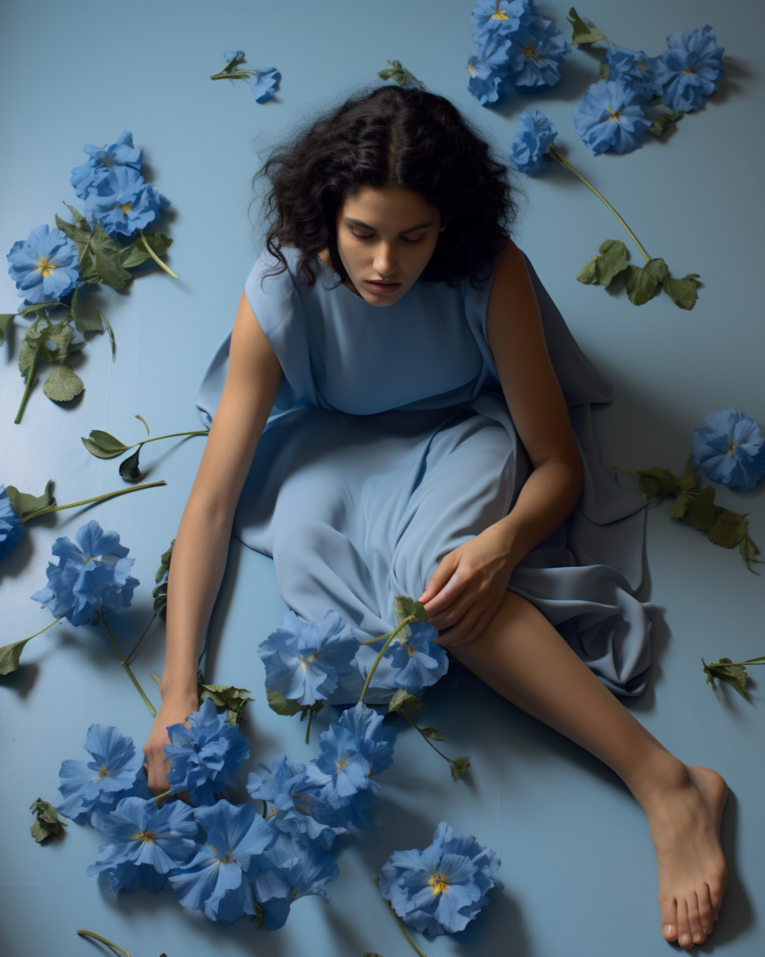 Woman in a blue dress sits on a blue floor with large blue flowers, creating a serene and artistic scene.