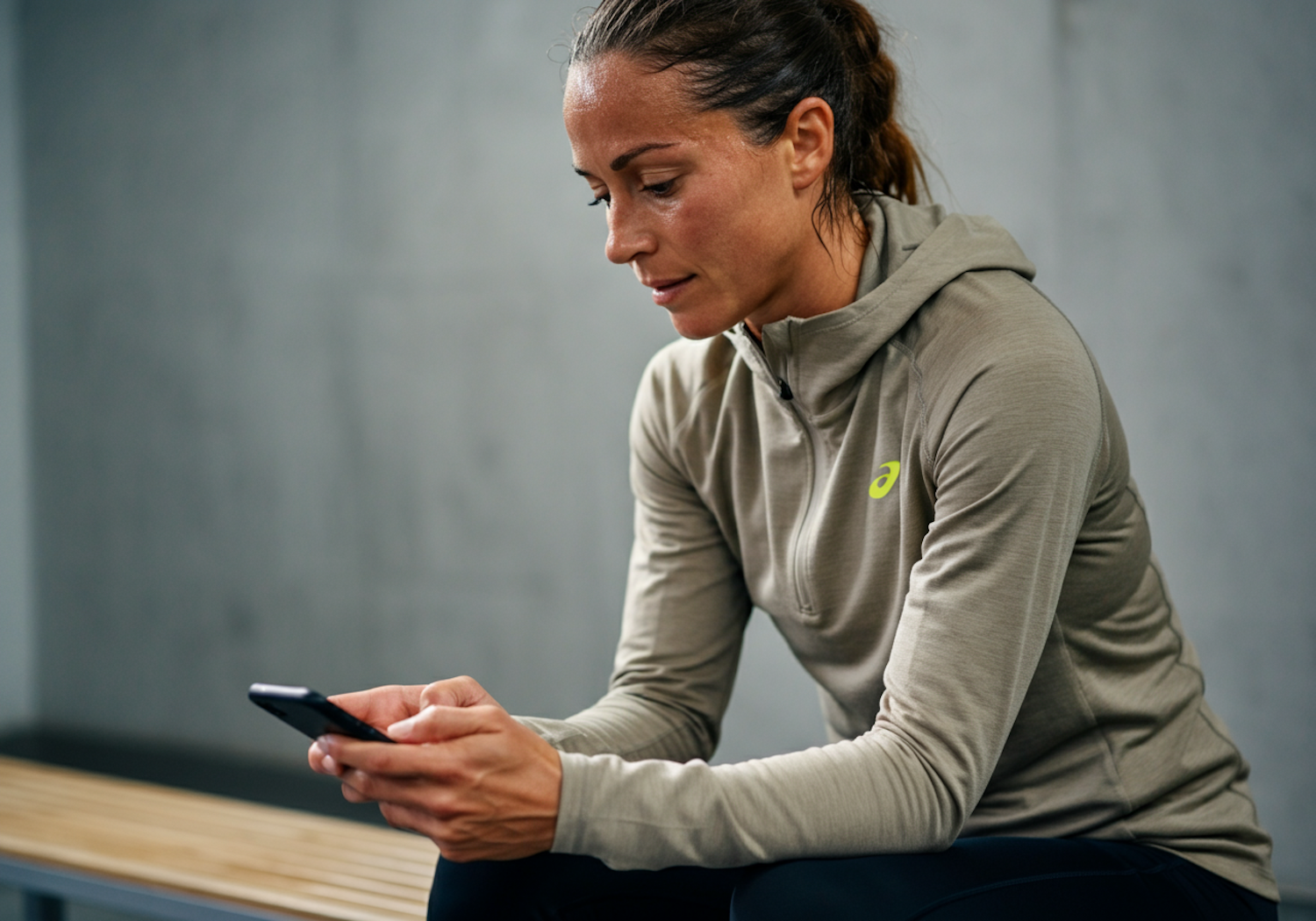 Focused woman in a gray hoodie using her smartphone, seated on a bench in a minimalistic setting. Perfect post-workout moment.