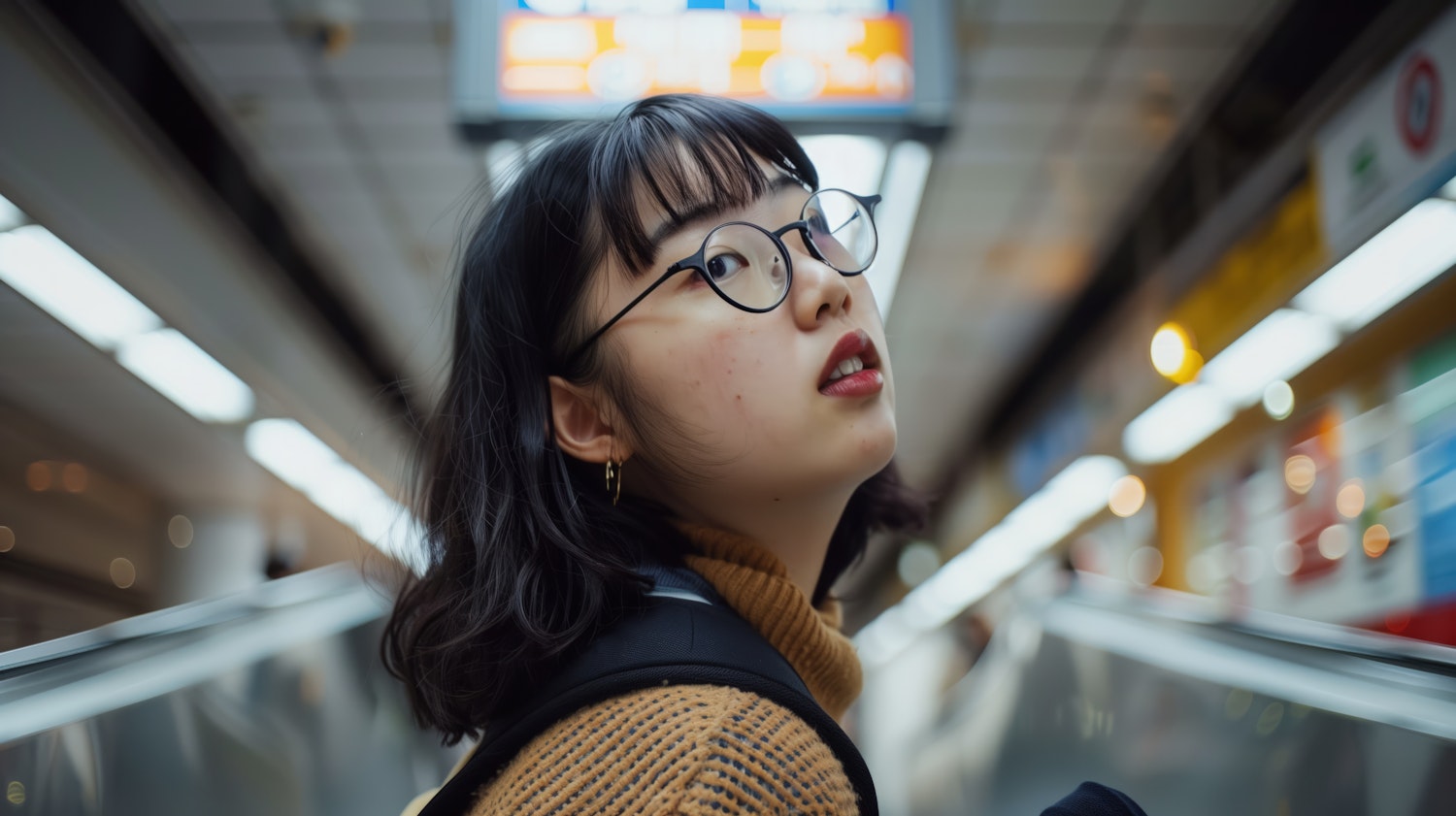 Asian woman with glasses in a subway, wearing a brown sweater, looking upwards with a thoughtful expression.