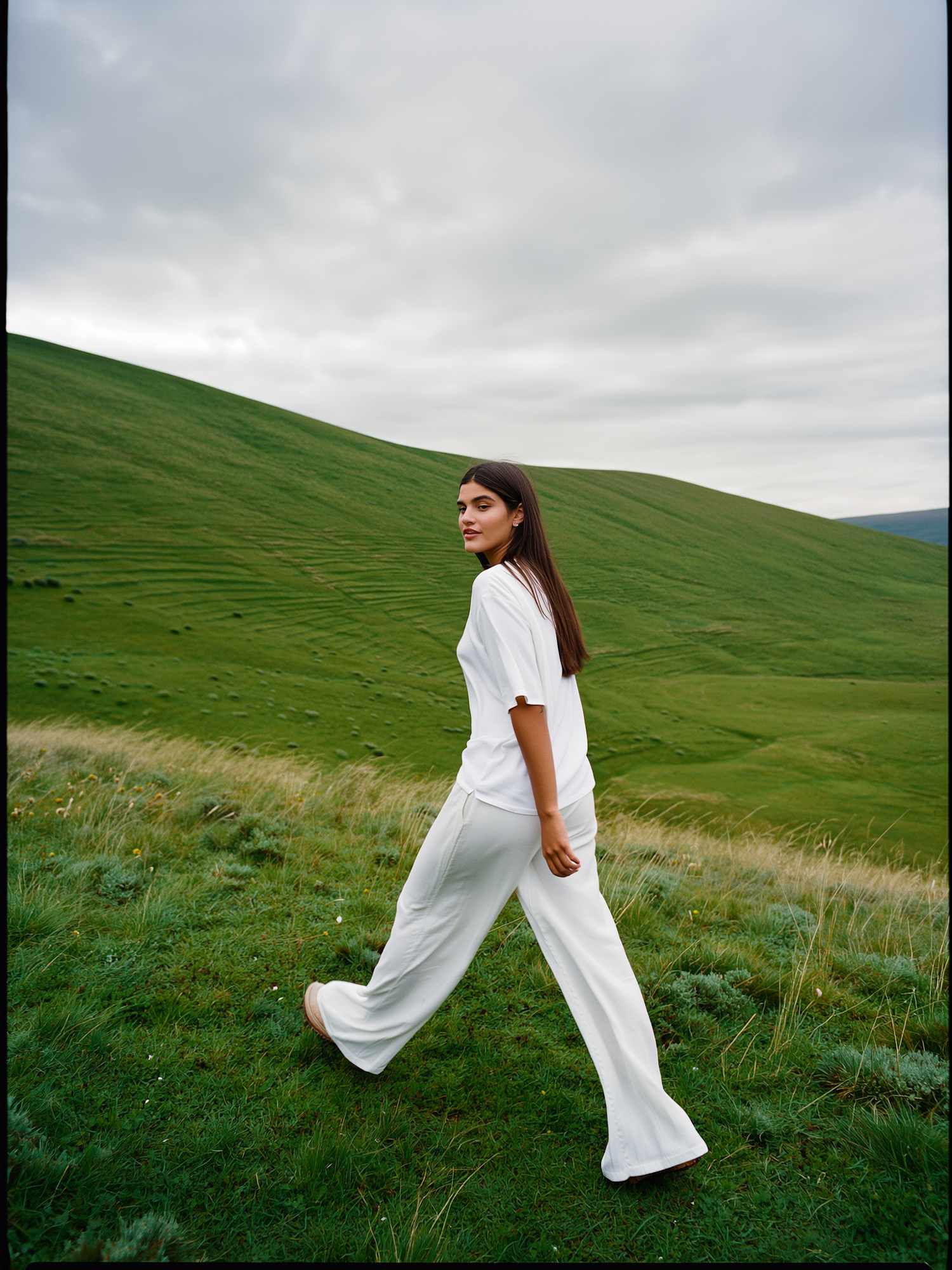 A woman in a white outfit walks on a lush green hill under a cloudy sky, creating a serene and natural atmosphere.