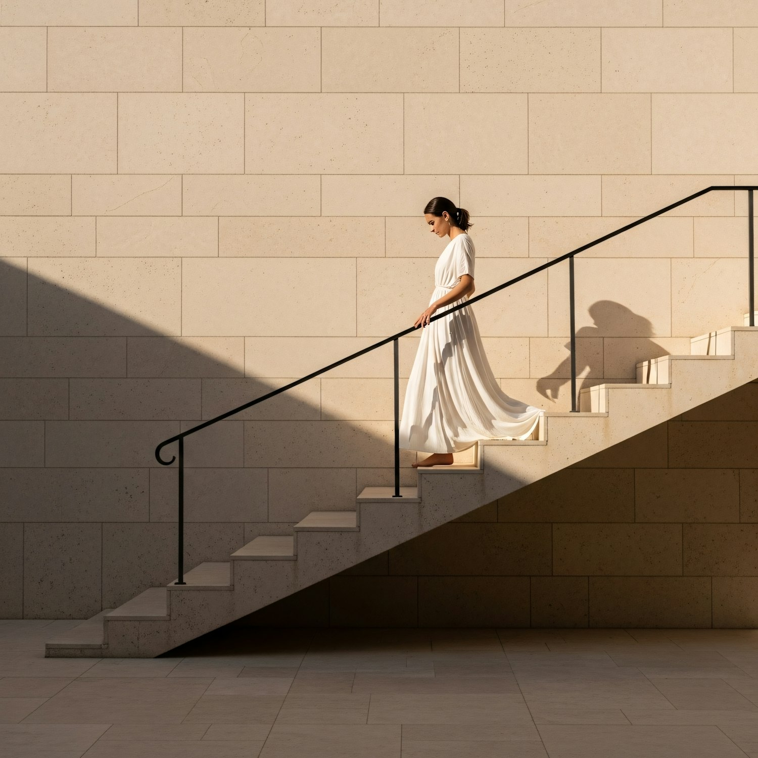 A woman in a flowing white dress descends a minimalist staircase, bathed in warm sunlight against a neutral stone wall.