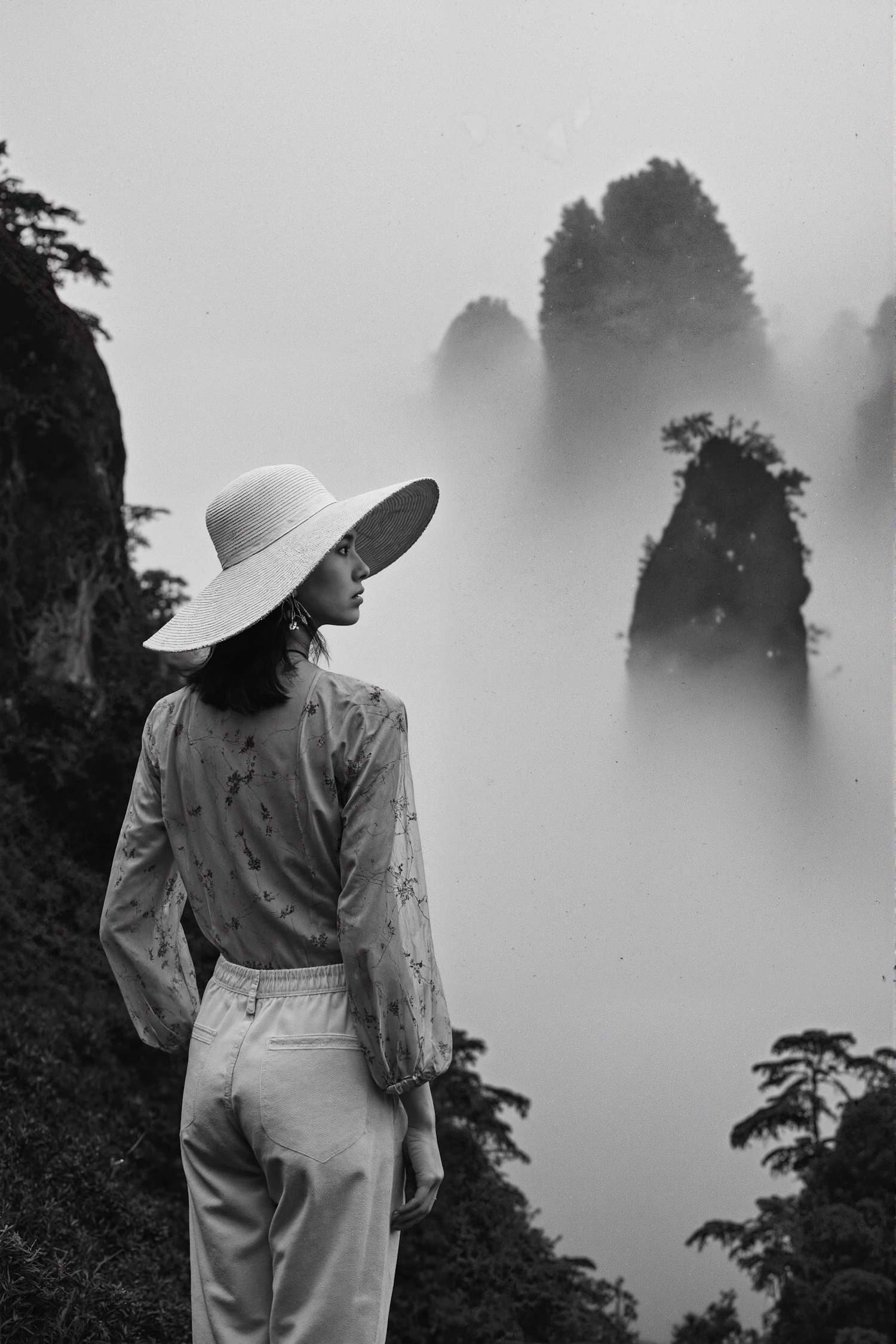 A woman in a wide-brimmed hat gazes at misty rock formations, blending elegance with nature's mystery in this black-and-white shot.