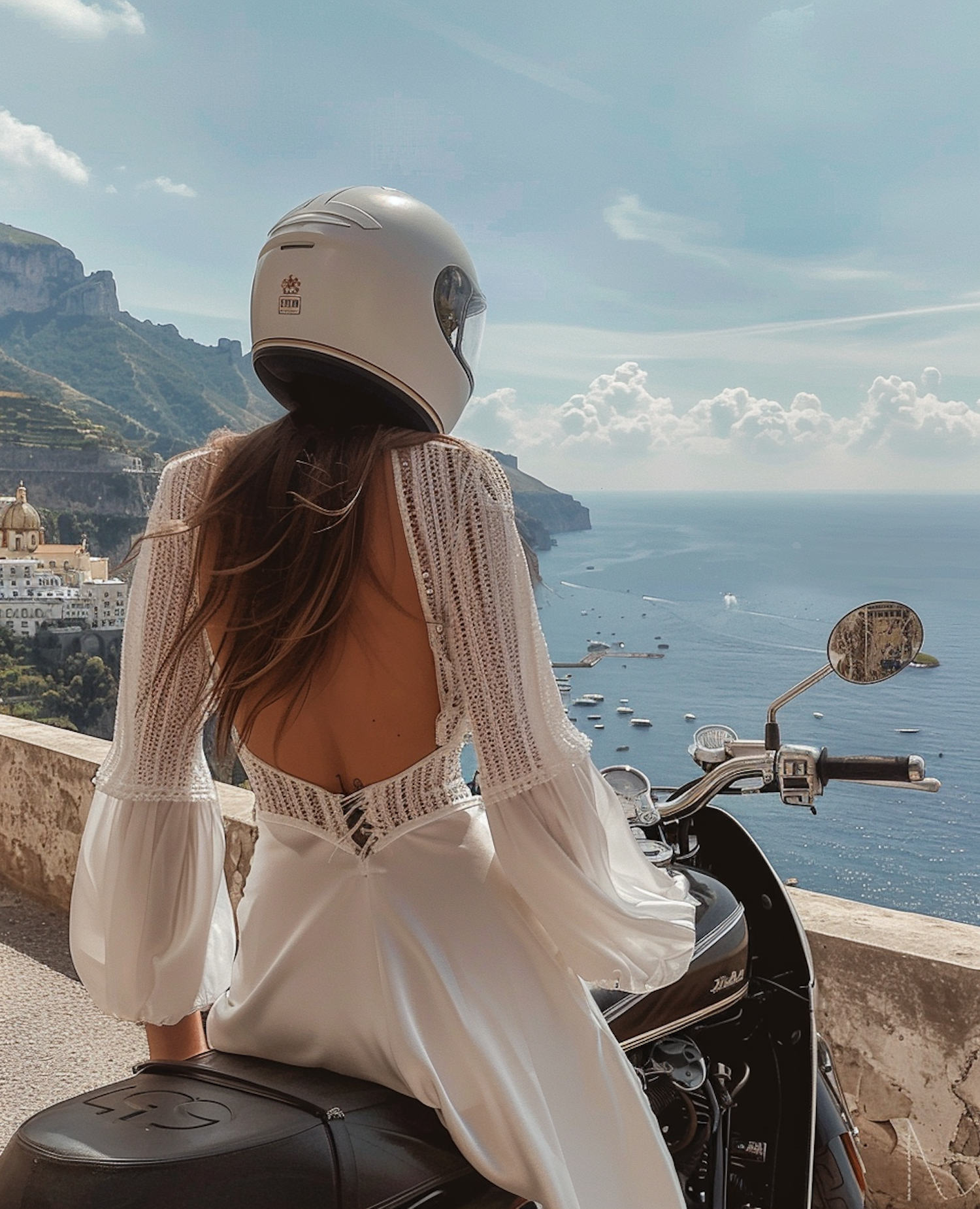 Woman in white dress and helmet on motorcycle, overlooking a stunning coastal view with blue sea and green hills.