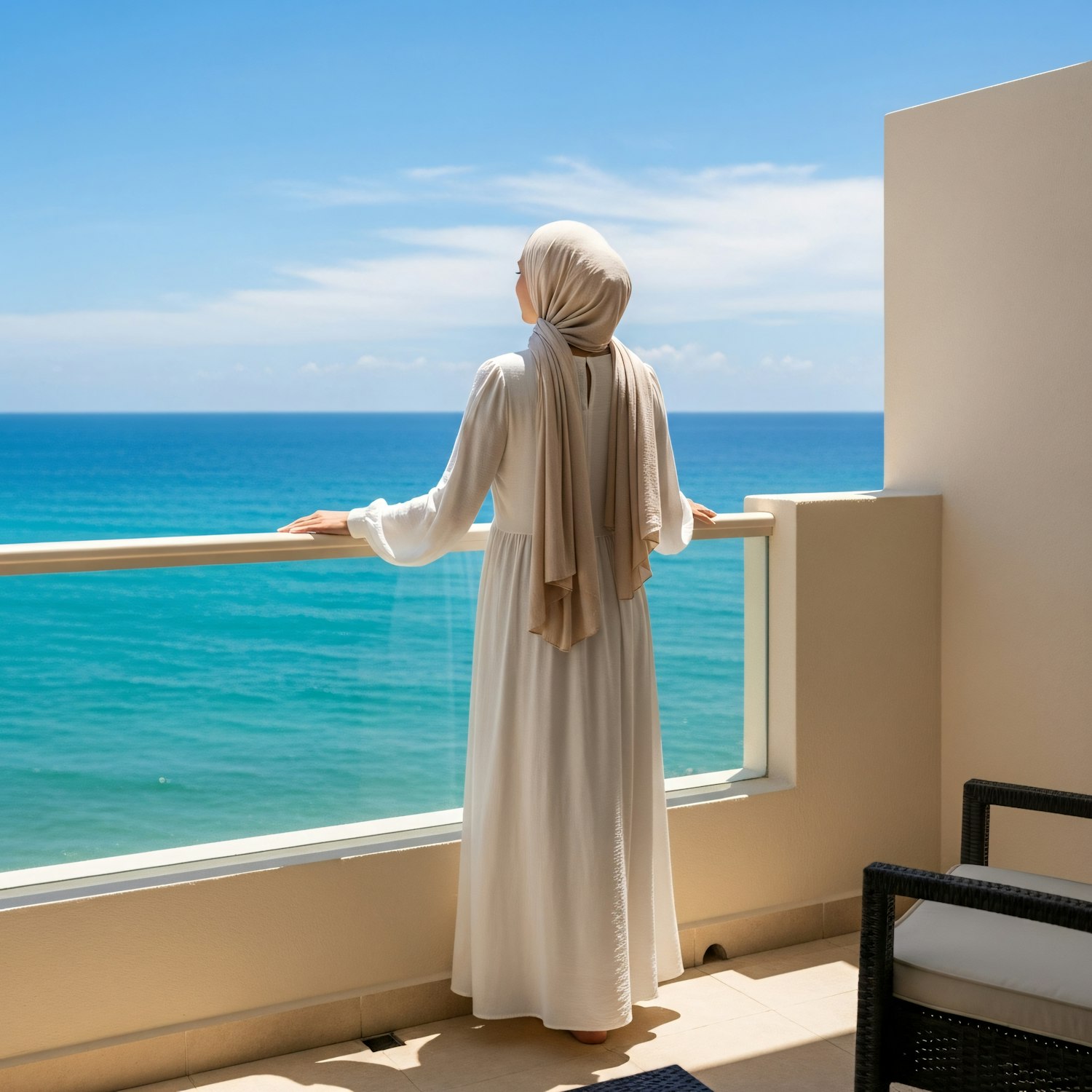 A serene moment on a balcony overlooking the ocean, with a woman in a beige hijab and white dress enjoying the view.
