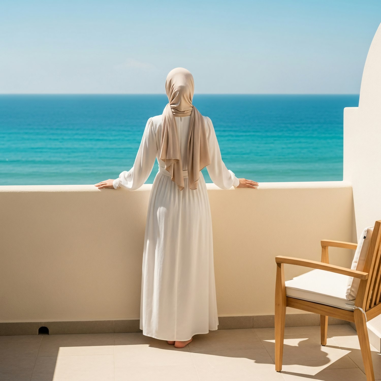 A serene view of a woman in a white dress and beige hijab on a balcony, gazing at the ocean under a clear blue sky.