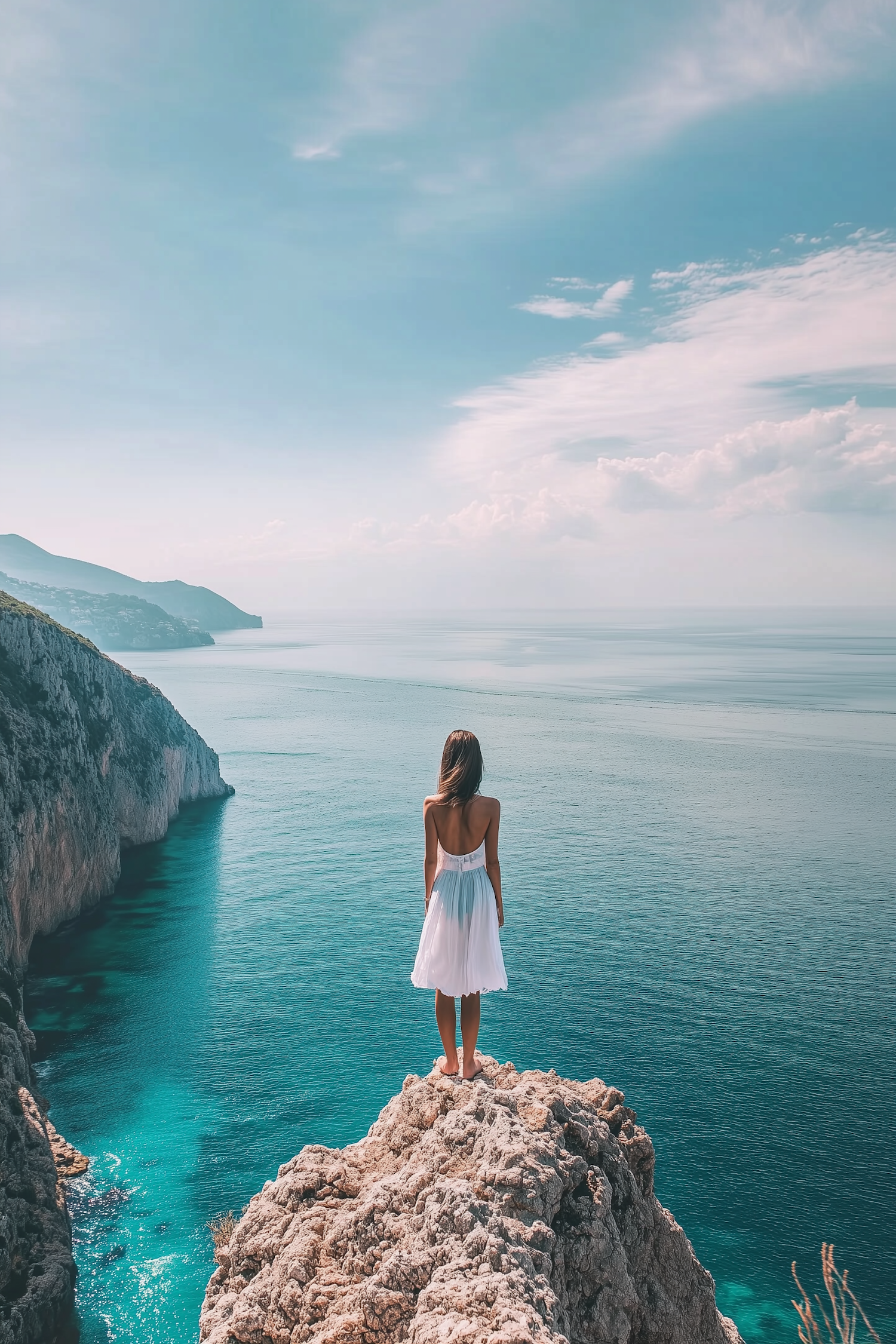 Woman in a white dress stands on a rocky cliff, overlooking turquoise waters and a serene blue sky with wispy clouds.