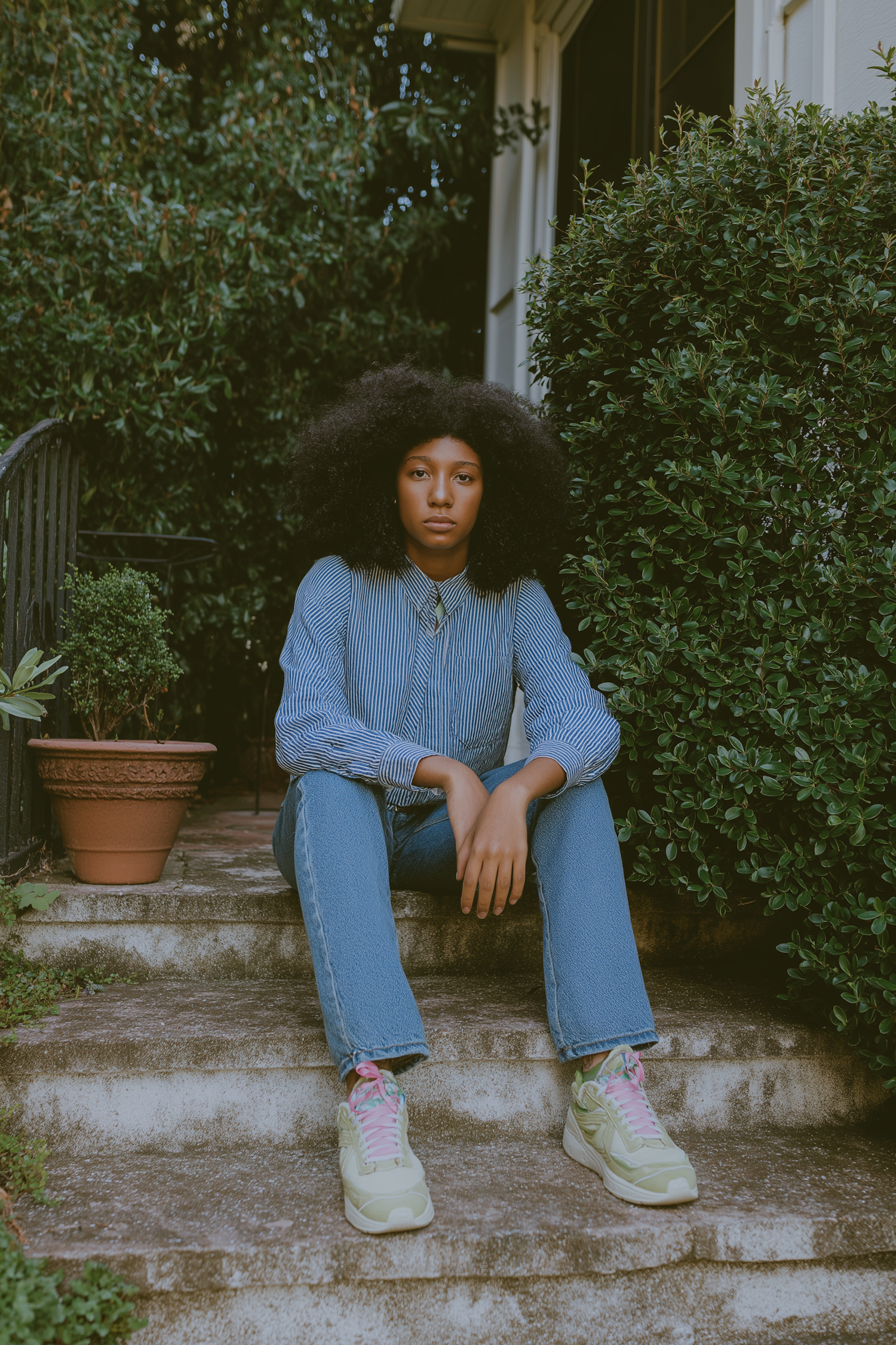 A young woman with curly hair sits on steps, wearing a striped shirt, jeans, and green sneakers, surrounded by lush greenery.