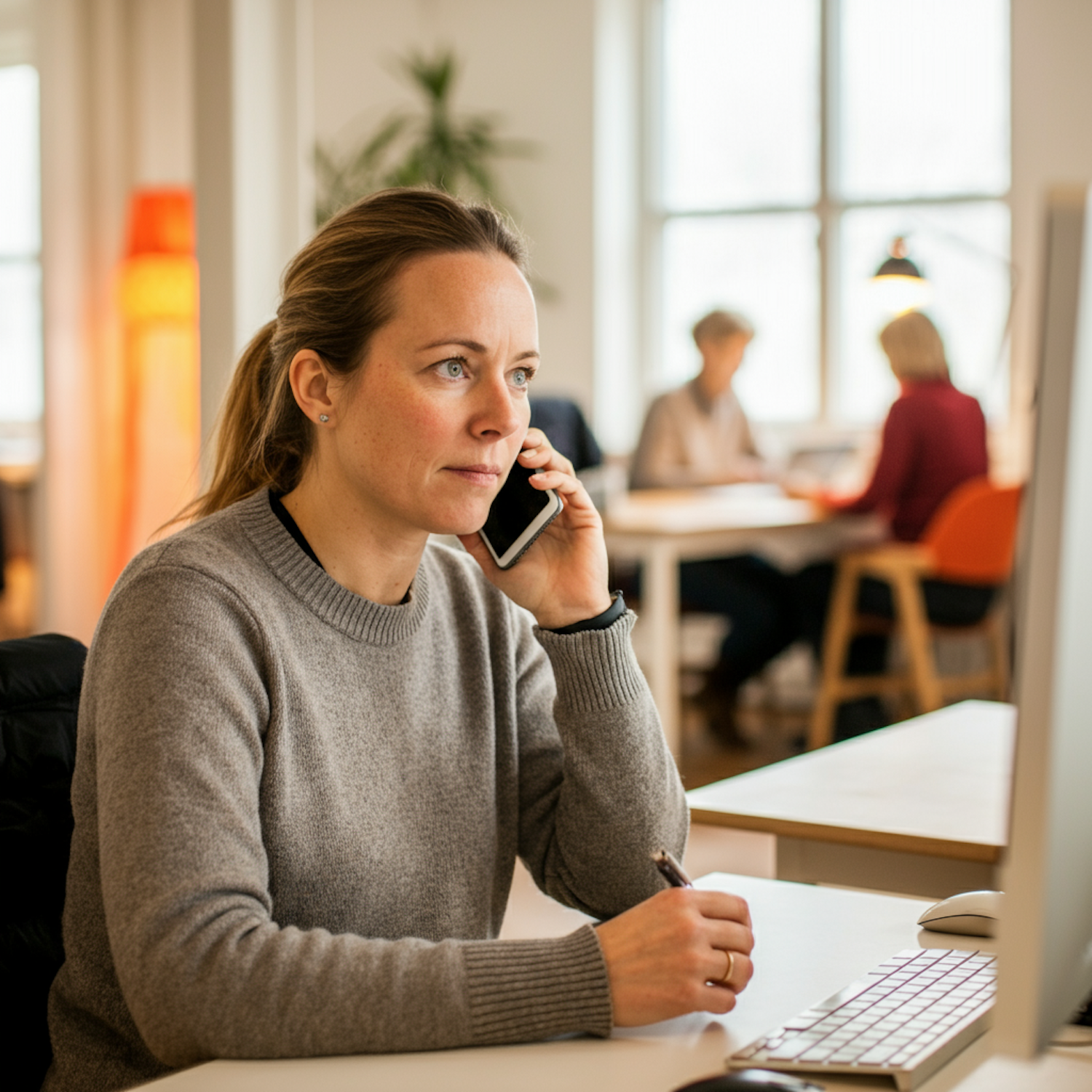 Focused woman in gray sweater on phone call at office desk, taking notes. Background shows colleagues in a modern workspace.