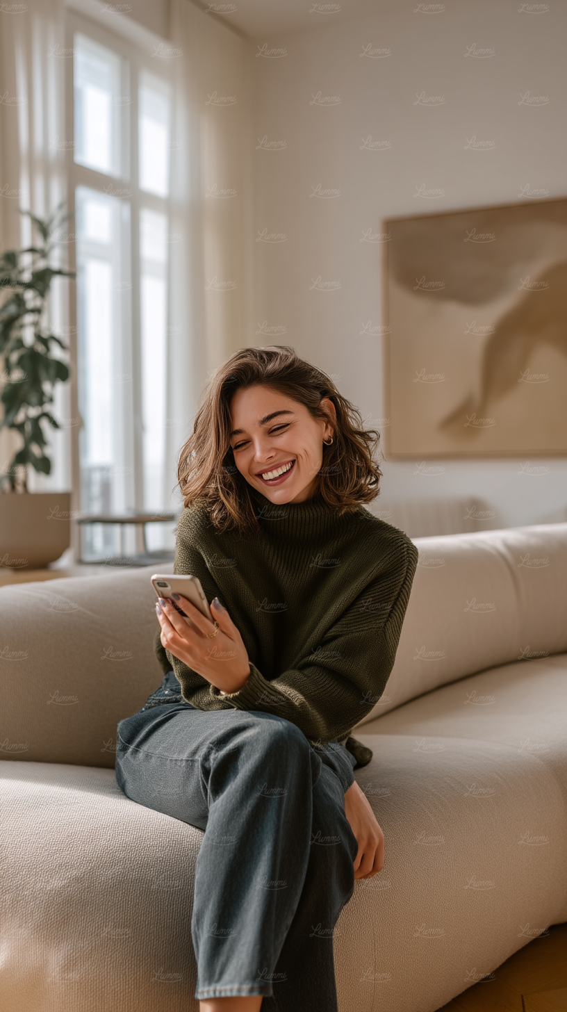 A smiling woman in a green sweater sits on a beige sofa, holding a smartphone in a bright, modern living room with natural light.