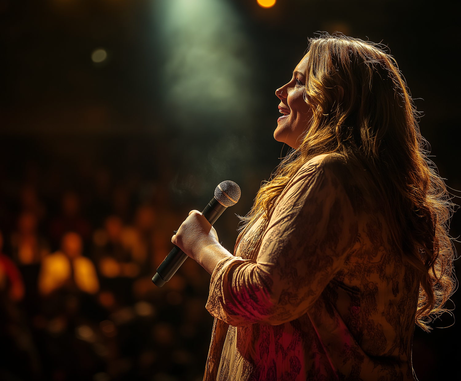 Woman on stage with microphone, warmly lit, performing to an engaged audience. Dramatic spotlight highlights her joyful expression.