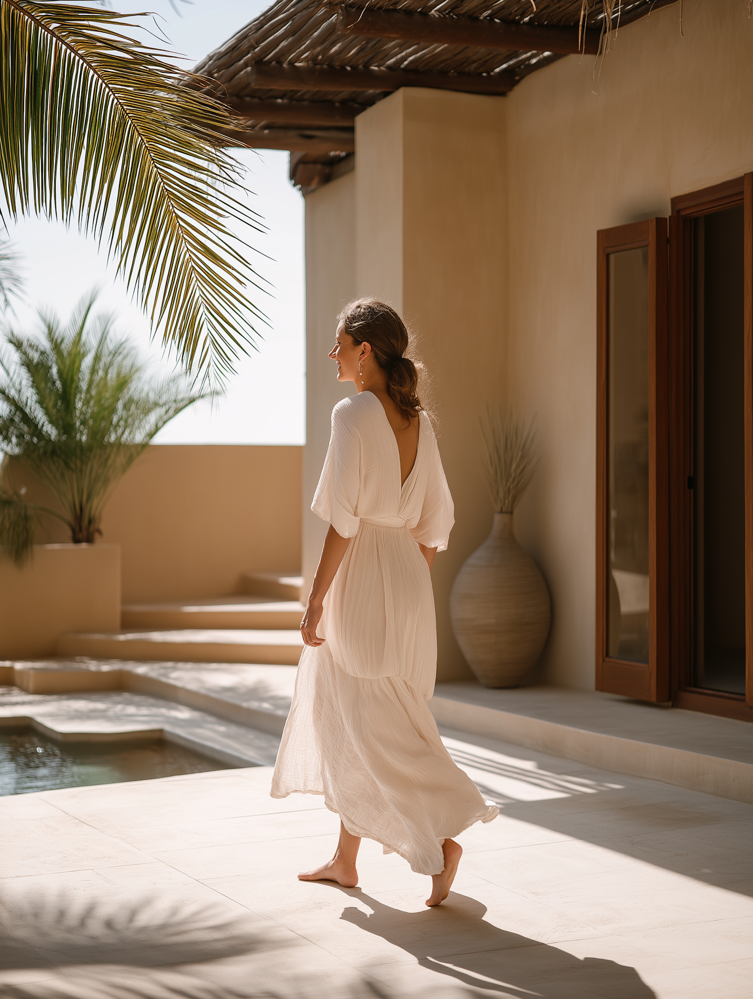 Woman in a flowing white dress walks on a sunlit patio with tropical plants and a wooden pergola, exuding serenity and elegance.
