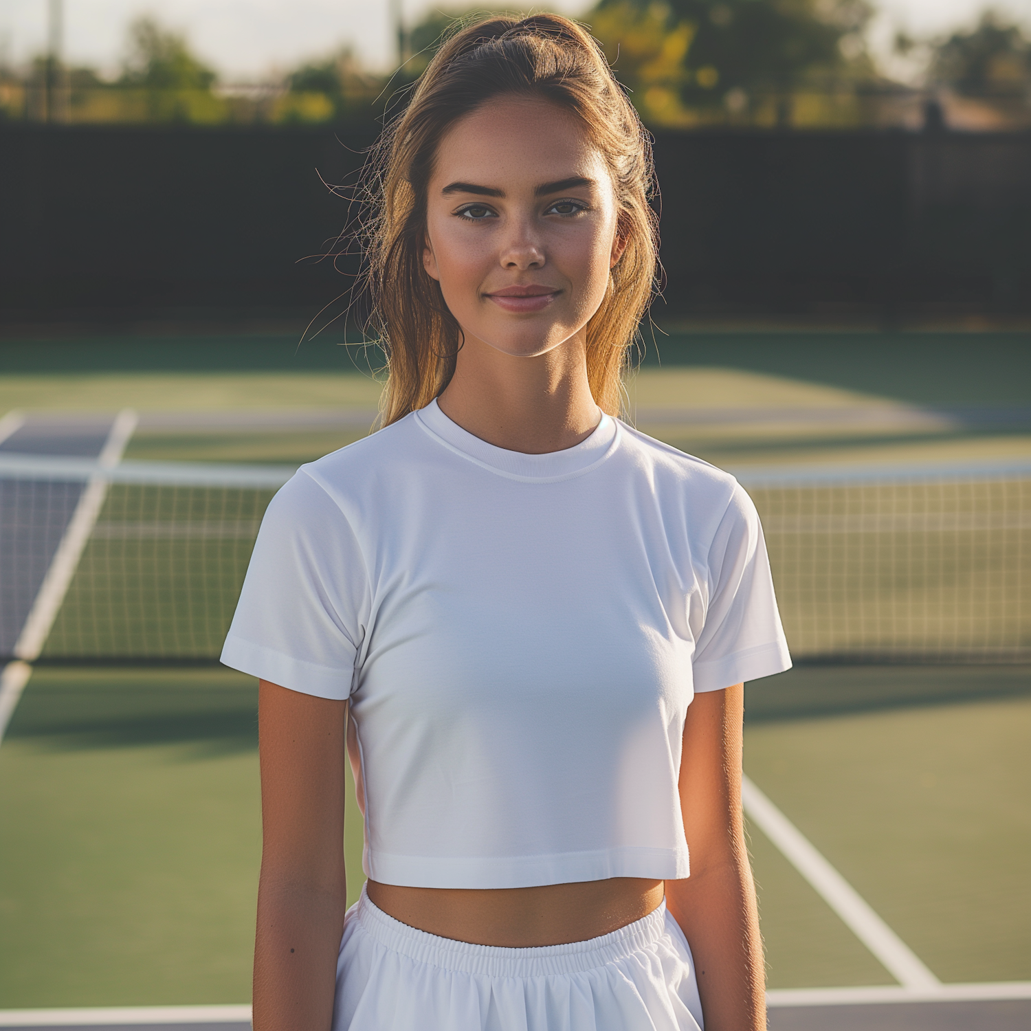 Young woman in white sportswear on a sunny tennis court, exuding confidence and energy.