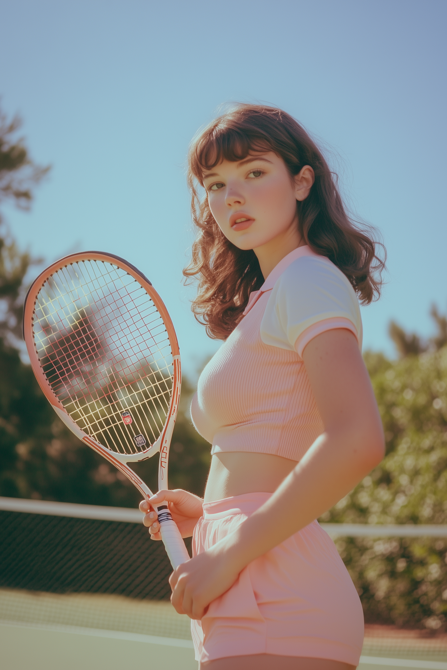 Young woman on a sunny tennis court holding a racket, wearing a pink outfit, with a serene outdoor backdrop of greenery and blue sky.