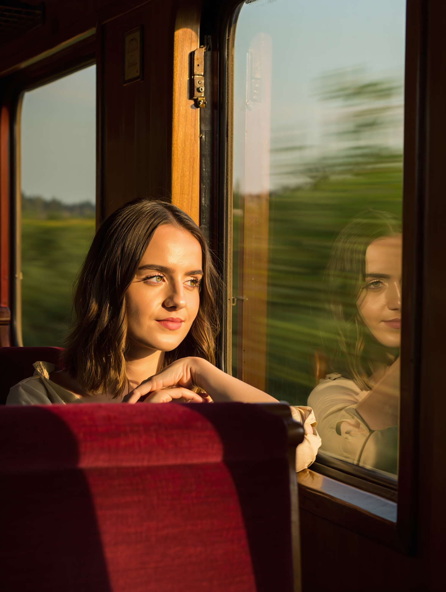 A serene moment of a woman gazing out a train window, bathed in golden sunlight, with a nostalgic wooden interior and blurred greenery outside.