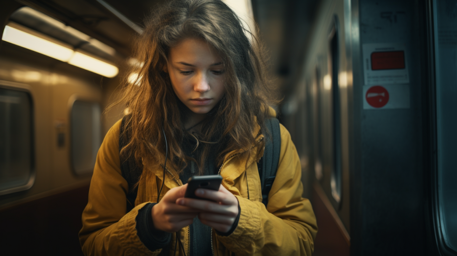 Young woman in a yellow jacket focused on her phone inside a dimly lit train, creating an urban and introspective atmosphere.
