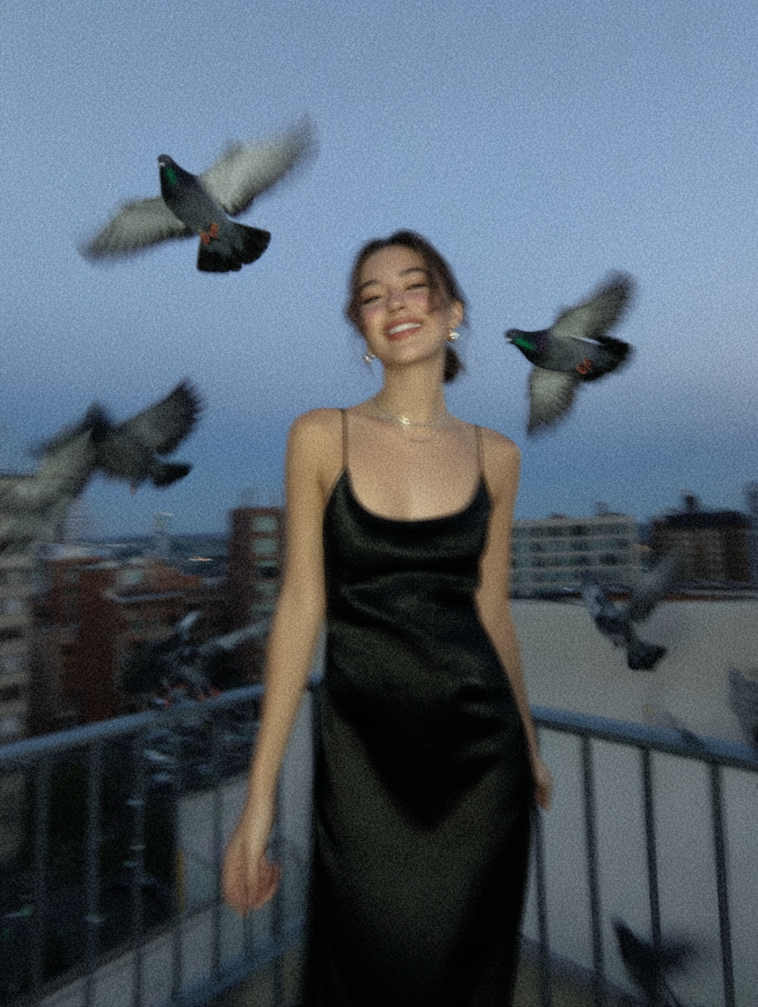 A woman in a black dress smiles on a balcony at twilight, surrounded by flying pigeons, with an urban skyline in the background.