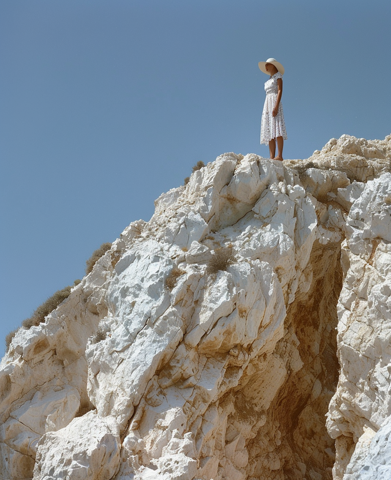 Woman in white dress and straw hat stands on rocky cliff edge against clear blue sky, conveying solitude and contemplation.
