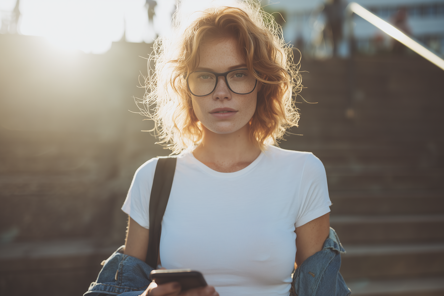 Young woman with curly blonde hair, glasses, and a white t-shirt holding a phone outdoors in warm sunlight.
