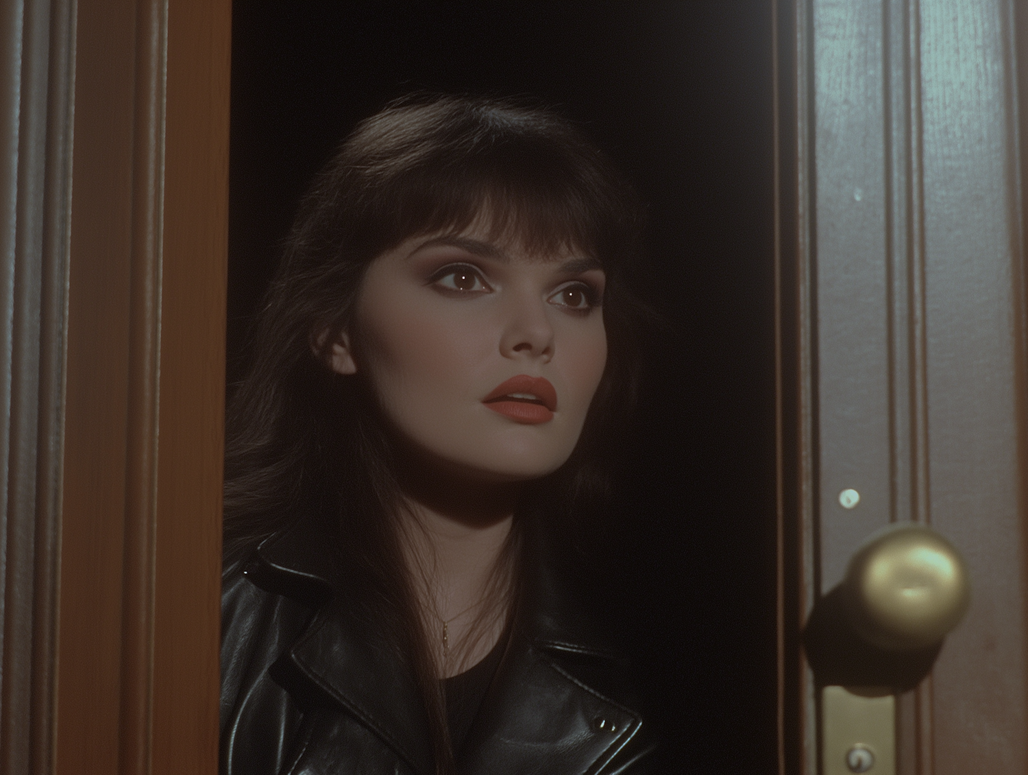 Mysterious woman peeking through a door, wearing a black leather jacket. Soft lighting and dark background create intrigue.