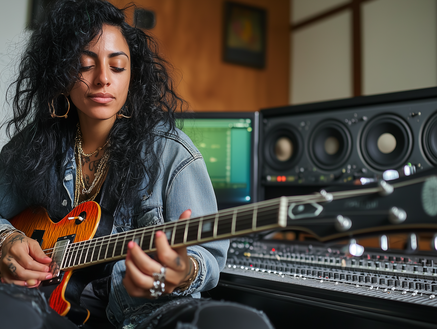 Woman with curly black hair playing electric guitar in a music studio, surrounded by mixing equipment and speakers.