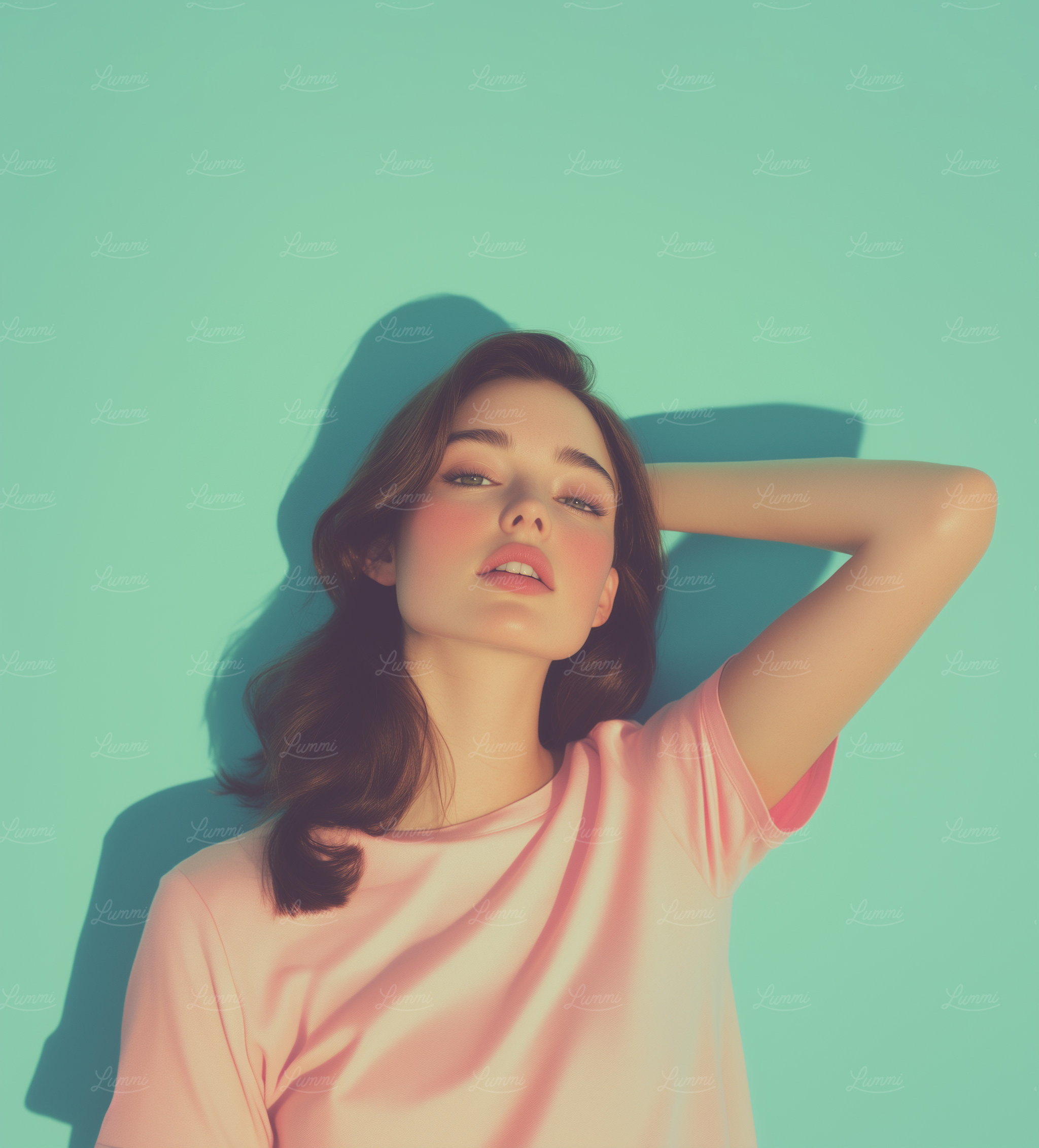 A young woman in a pink t-shirt poses confidently against a turquoise background, her dark brown hair framing her face beautifully.