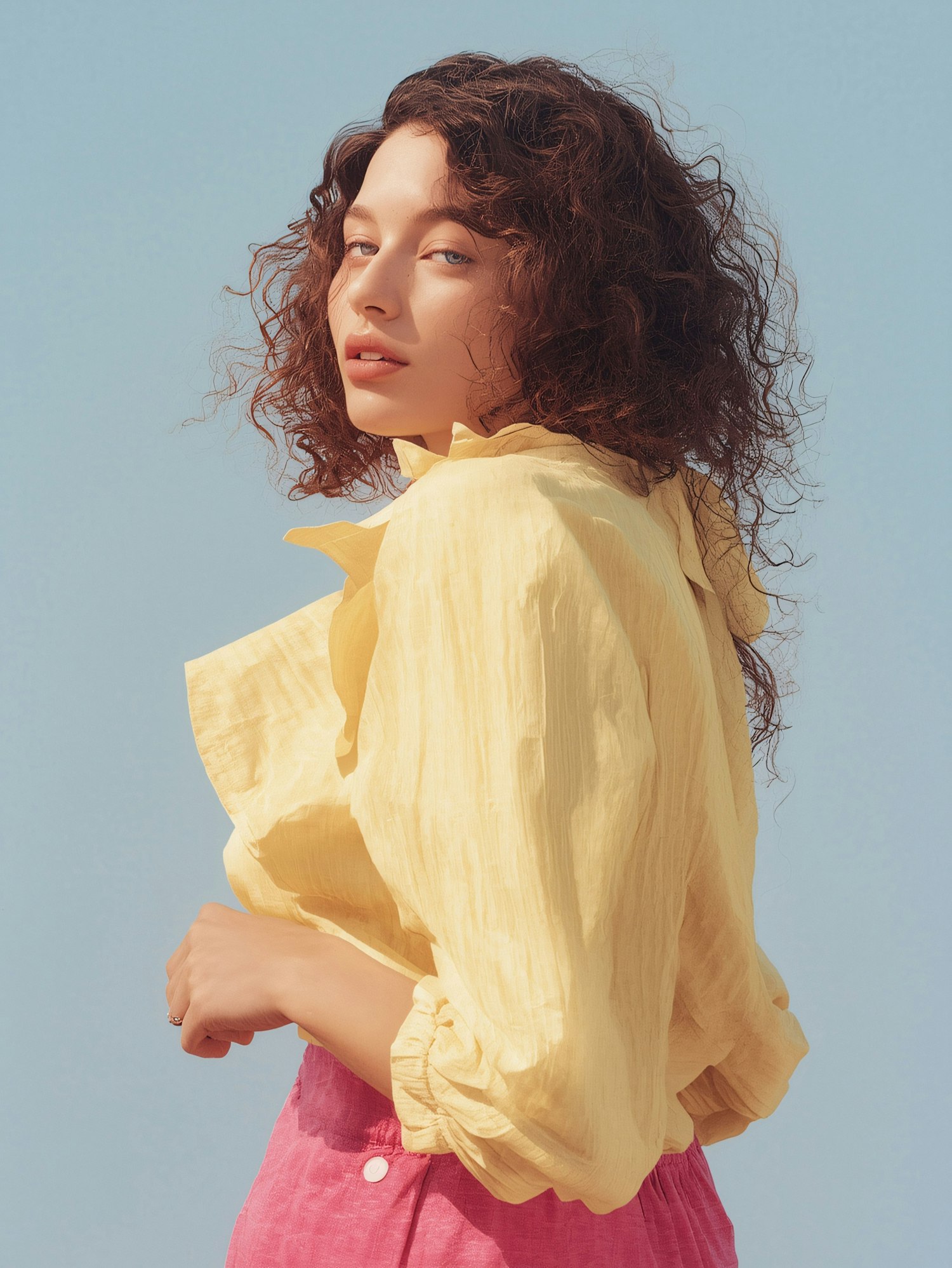 A woman in a yellow blouse and pink pants poses against a clear blue sky, showcasing a vibrant and stylish look.
