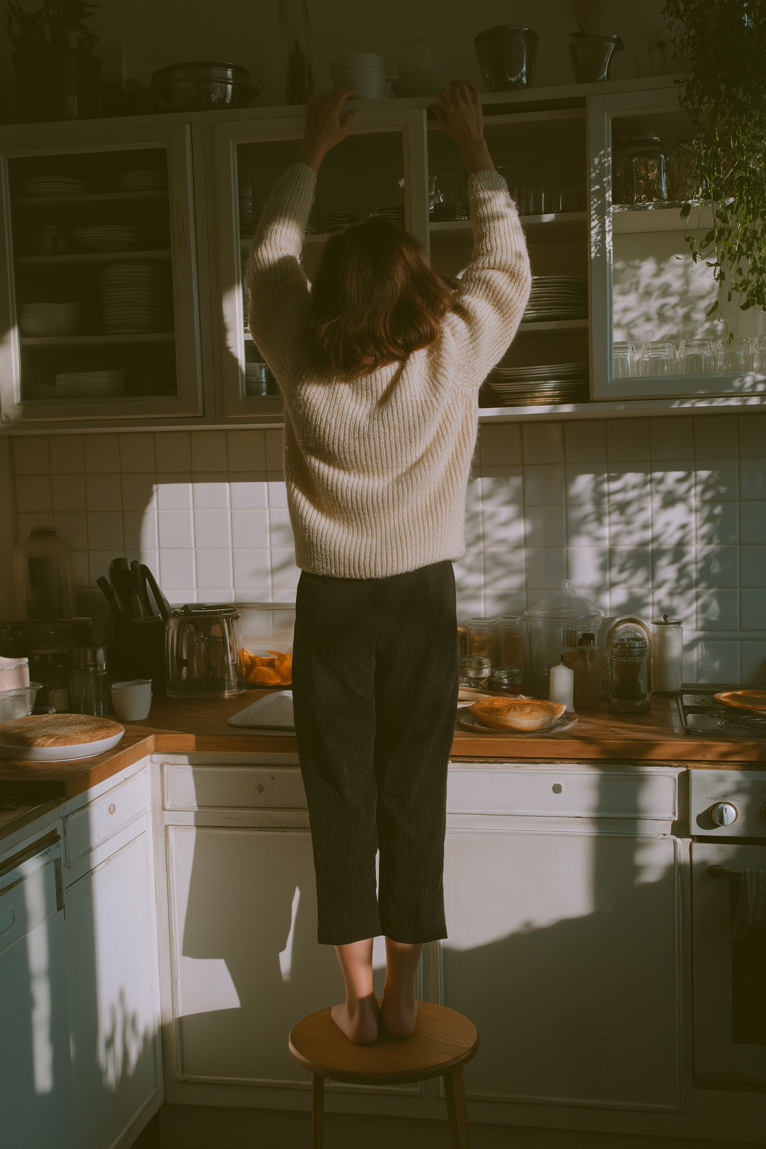 A person stands barefoot on a stool in a warm kitchen, reaching into a top cabinet. Soft sunlight casts gentle shadows on the walls. Top shelf candids.